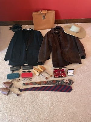 Men's Boutique. Two leather jackets, incl one Claiborne; leather briefcase; Columbia straw hat; Versace glasses; wood shoe forms; ties; other related items as seen in photos. Located on the second floor.