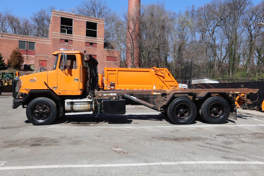1990 White GMC ACL Roll-off Truck. VIN: 4V2SCBRF0LU506554. Body: Chassis 2D. Engine: DETROIT SERIES 60, 12.7L I6 DI Diesel. Odometer reading: 40638. Galbreath roll-off body. Seller reports: Runs, drives, small air leak/hydraulic leak. Title & key available.