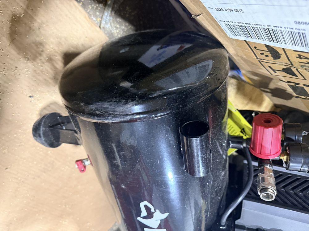 Husky 8 gallon air compressor rated 150 PSI with 1.8 HP motor and oil free pump, includes gauges and regulator; Amflo 50 foot 3/8 inch rubber air hose rated 300 PSI; coil of 1 inch black pipe. Seller reports in working condition. No assistance or equipment is available at pickup.