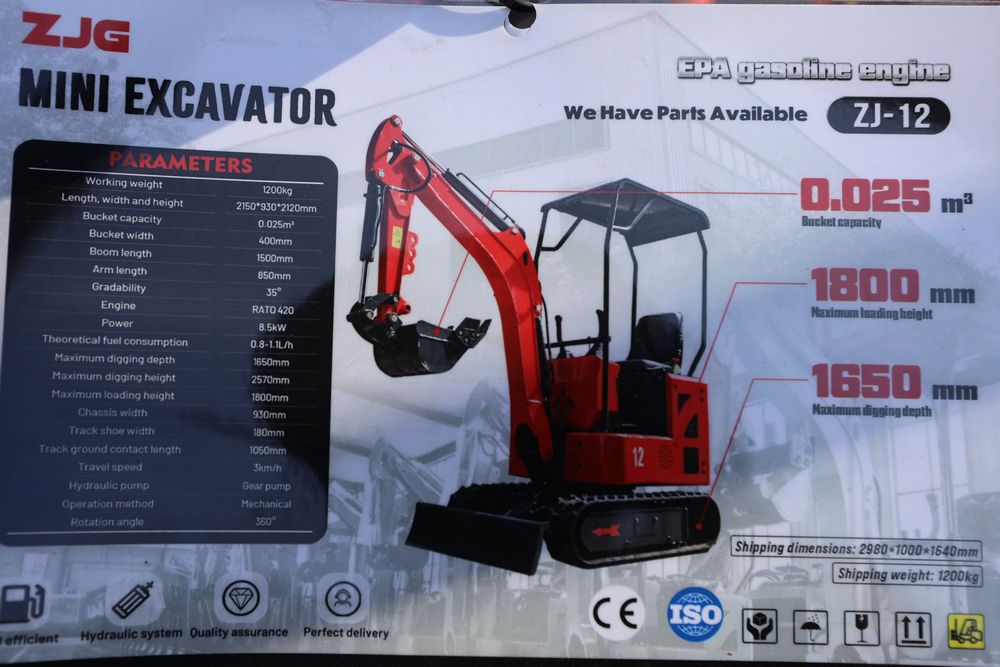 New 2026 ZJG Mini Excavator, model: ZJZ-12 with canopy, dozer blade, bucket, and gas engine. Hours reading less than 1 hour.