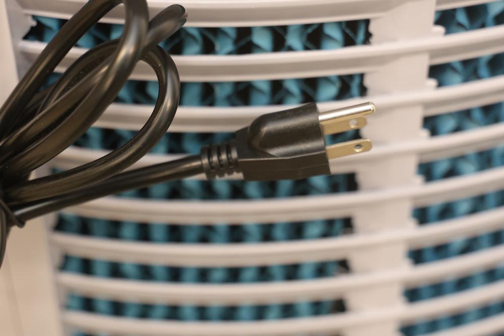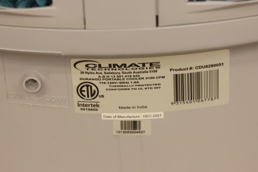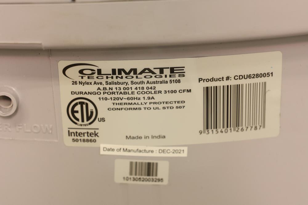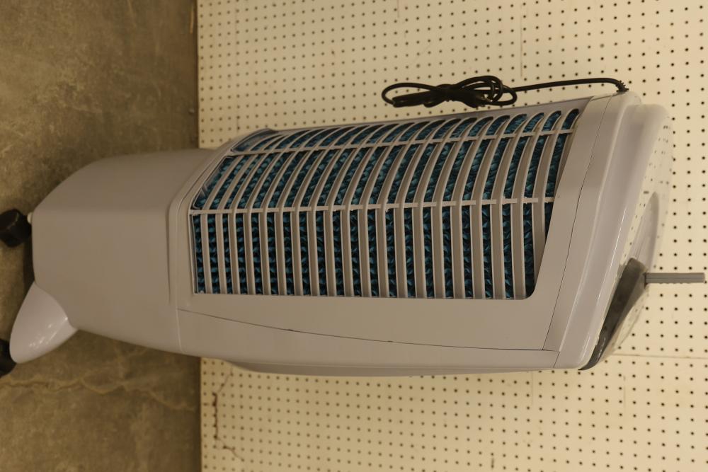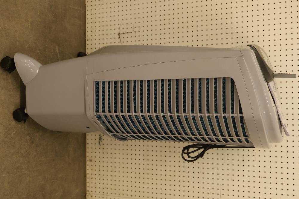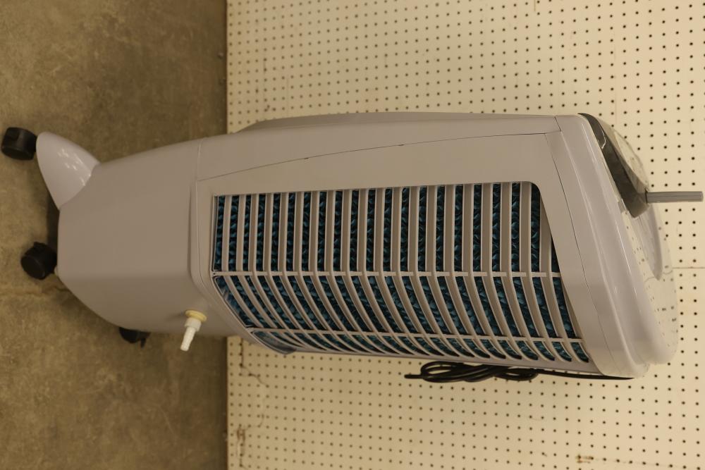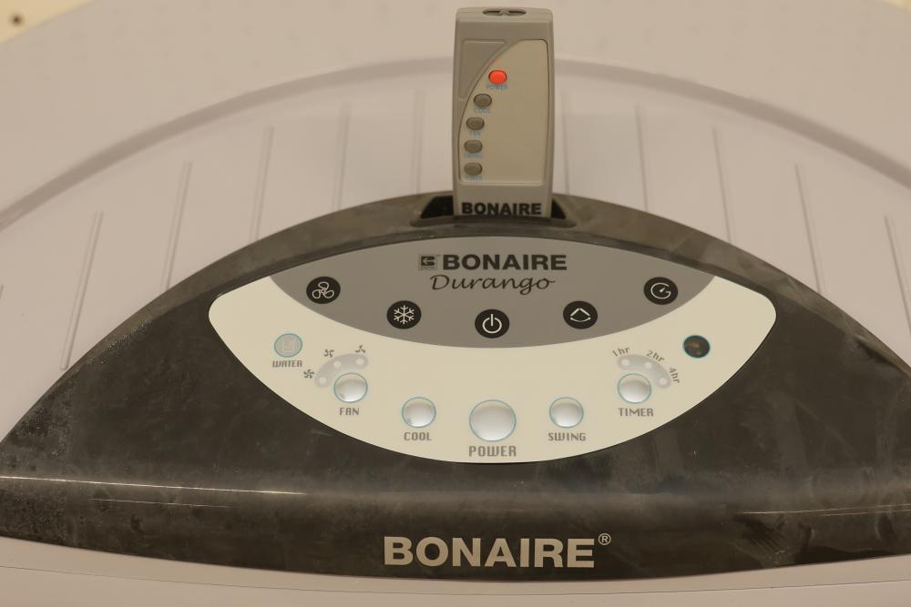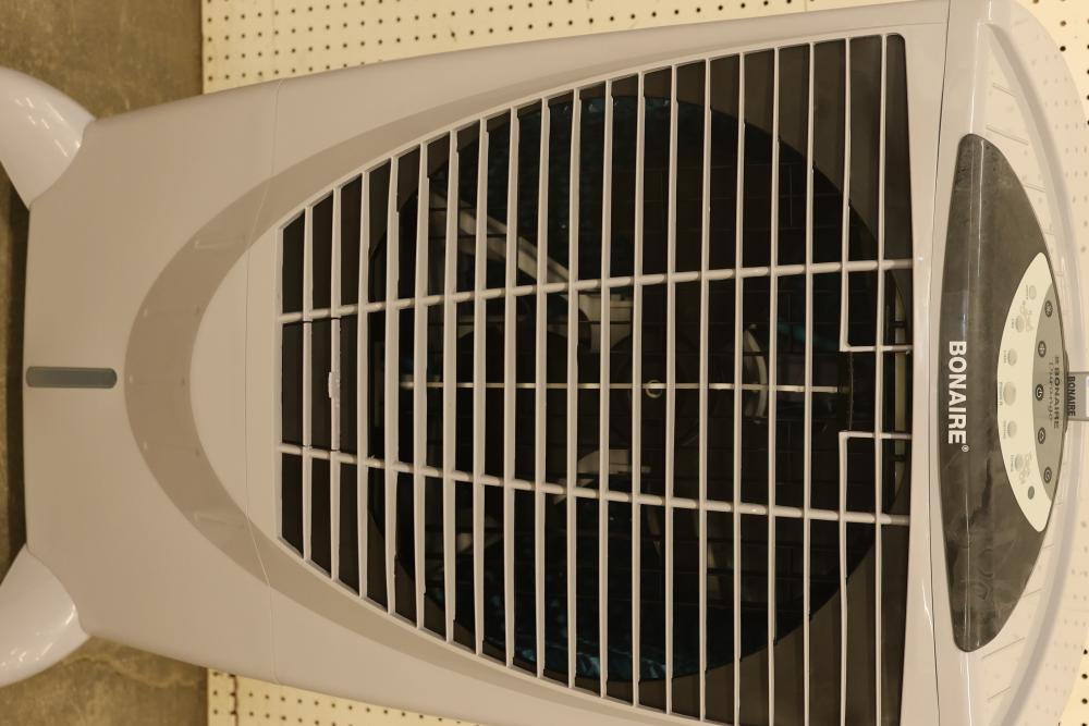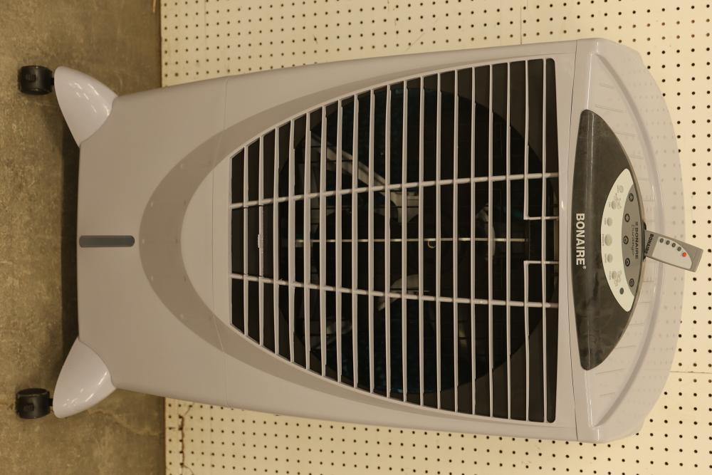 Bonaire Durango 3100 CFM Portable Evaporative Air Cooler with Remote, Model CDU6280051. Quantity of two. Features adjustable control panel, remote control, and removable filters. Instruction manual is included. Specifications: 120 V, 60 Hz, 1.9A. Pickup only.