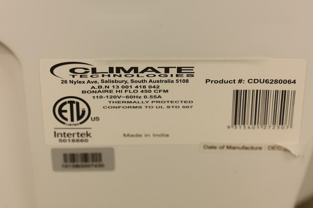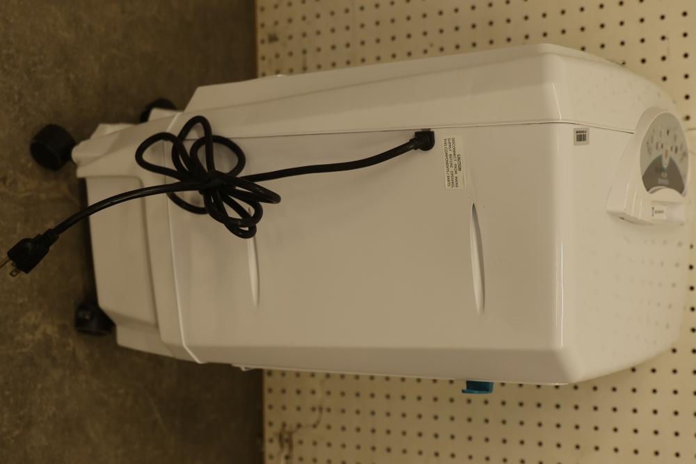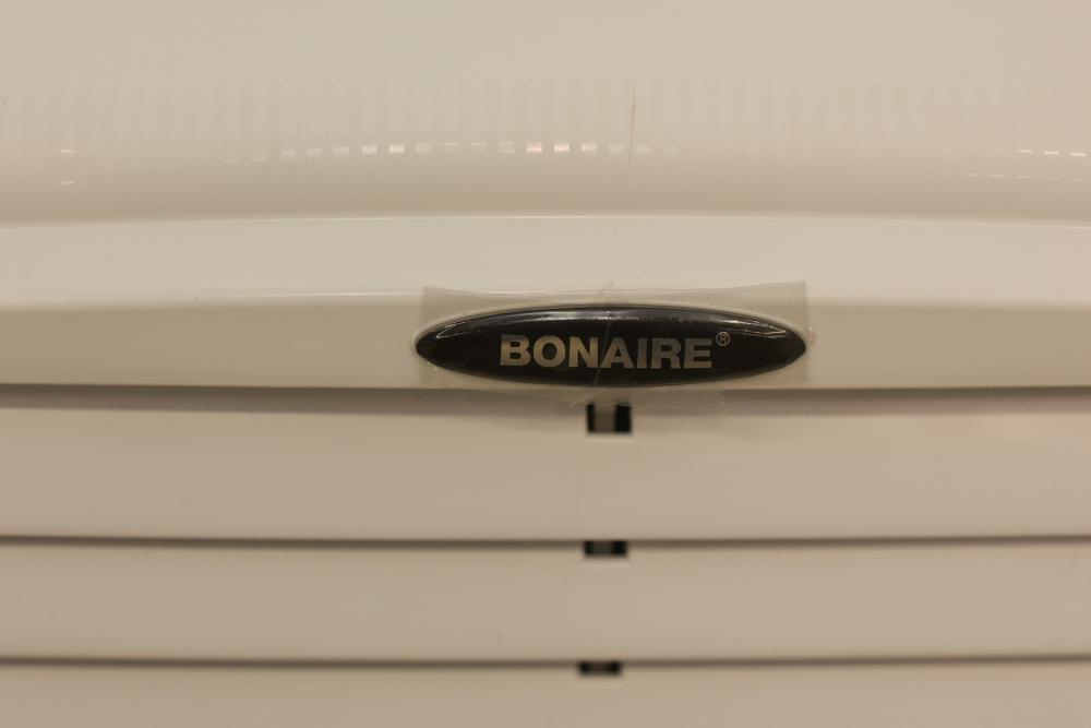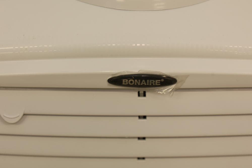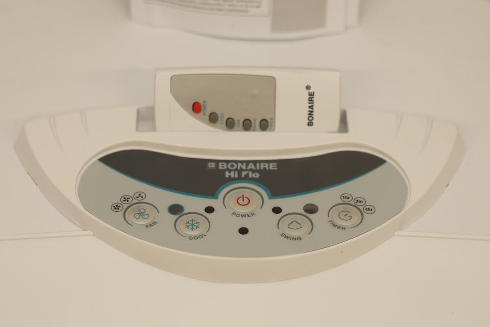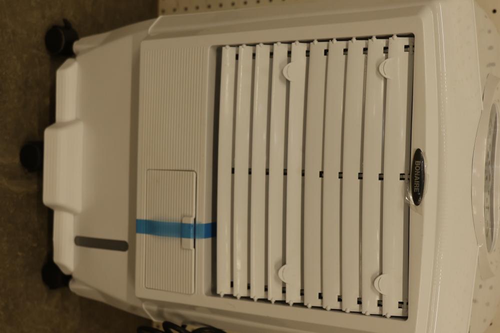 Bonaire Hi Flo 450 CFM Portable Evaporative Air Cooler with Remote, Model CDU6280064. Quantity of two. Features include an adjustable control panel, remote control, and removable filter. Instruction manuals are included. Specifications: 110-120V, 60Hz, 0.55A. Pickup only.
