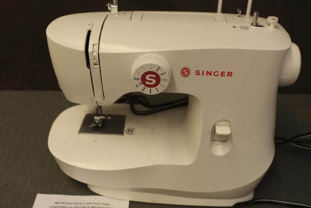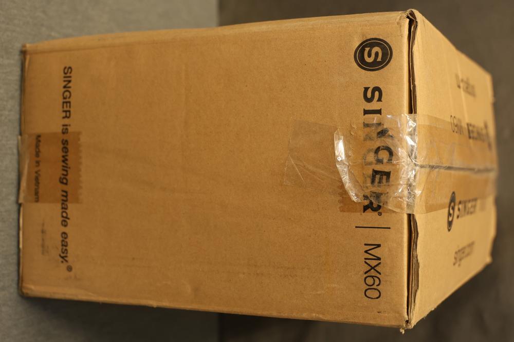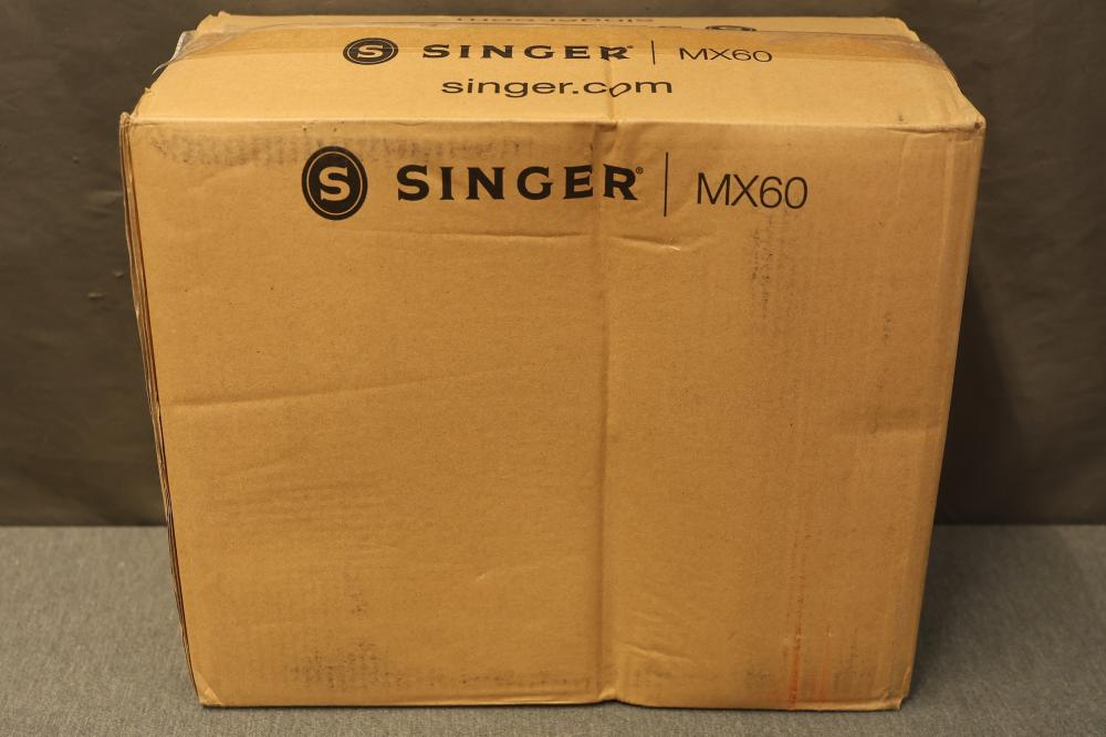 Singer MX60 Lightweight Portable Sewing Machine. Includes the sewing machine, power cord, foot pedal, manual, and small accessories. The item appears unused and comes in the original box, which shows wear from handling.