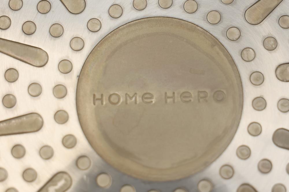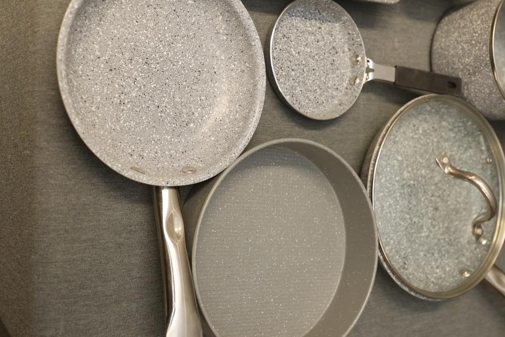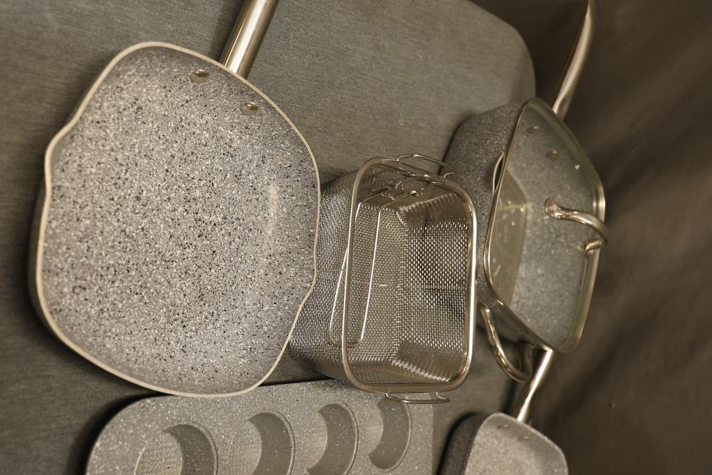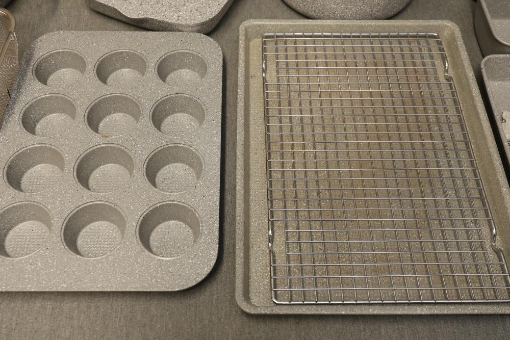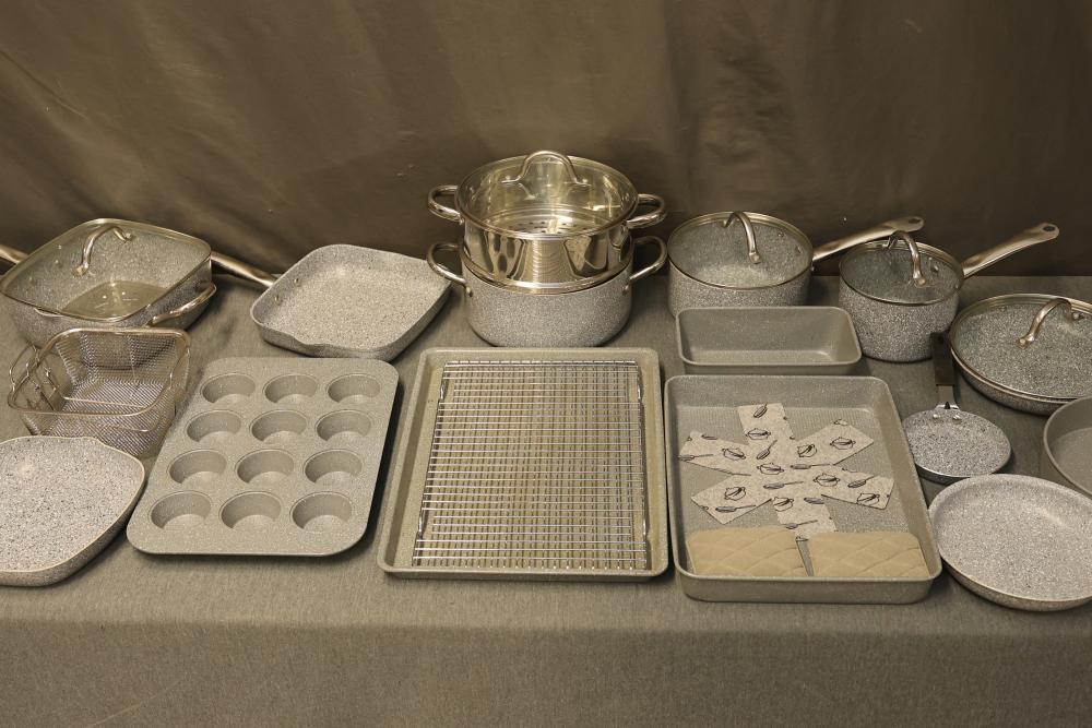 Home Hero Cookware Set With Nonstick, Oven-Safe Granite Color Pieces. Includes a baking tray, a casserole pan with a steamer, a muffin tray, pan protectors, cleaning sponges, and multiple pots and pans. The cookware is designed in granite coloring and features nonstick properties for easy cleaning. All items are oven safe. Pickup only.