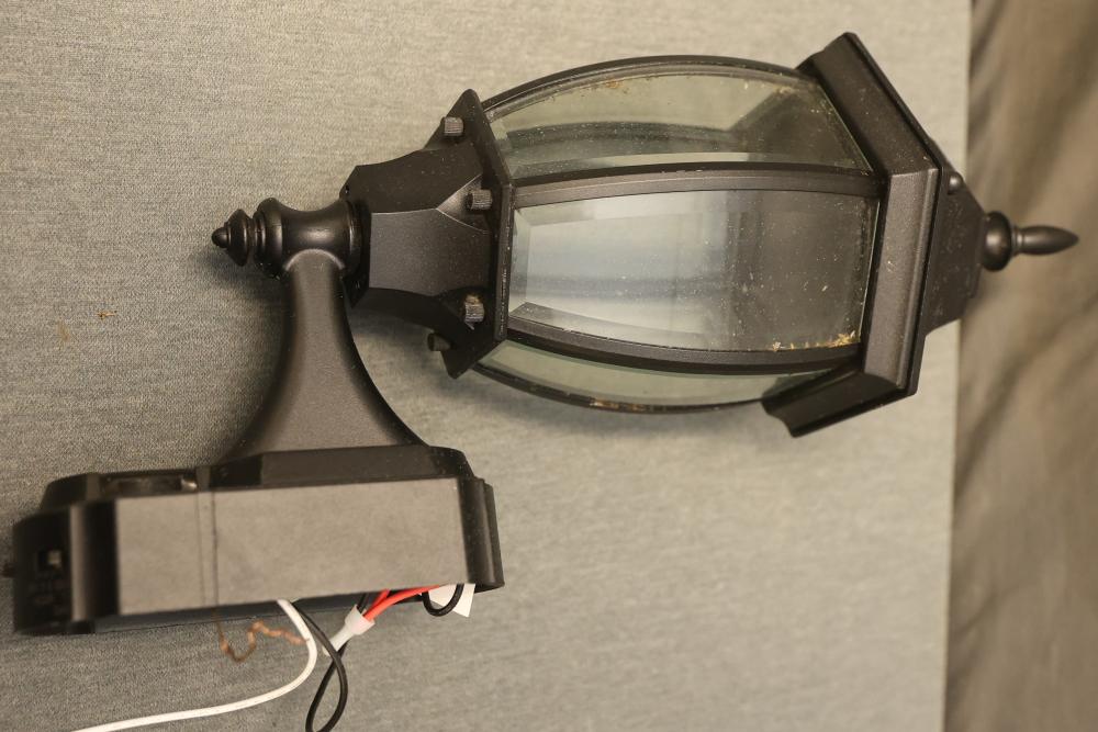 Heath Zenith HZ-4192-BK Six-Sided Die-Cast Aluminum Lantern with Beveled Glass in Black. Quantity of 4. Features die-cast aluminum construction with a black finish and beveled glass panels. All units show some signs of prior use and wiring is exposed. Pickup only.