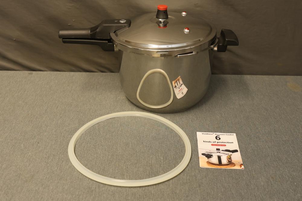 Vividness Pressure Cooker in Stainless Steel with 4 Liter Capacity. Features include a durable construction with a secure locking lid, a pressure release valve, and 6 kinds of explosion-proof safety measures. Comes with a sealing ring and user manual.