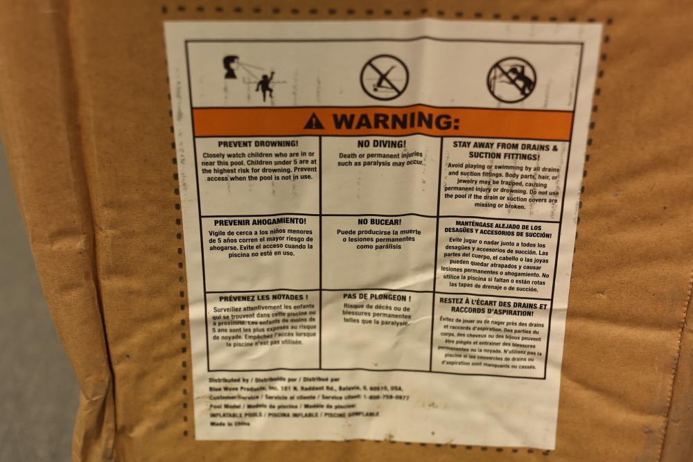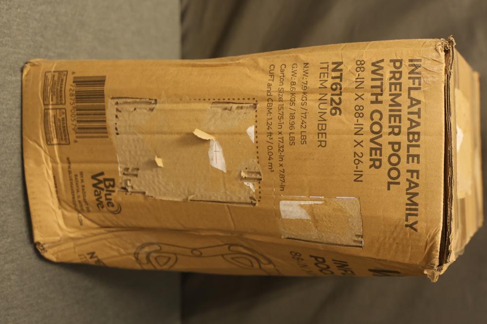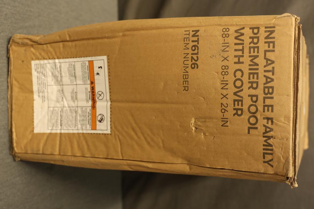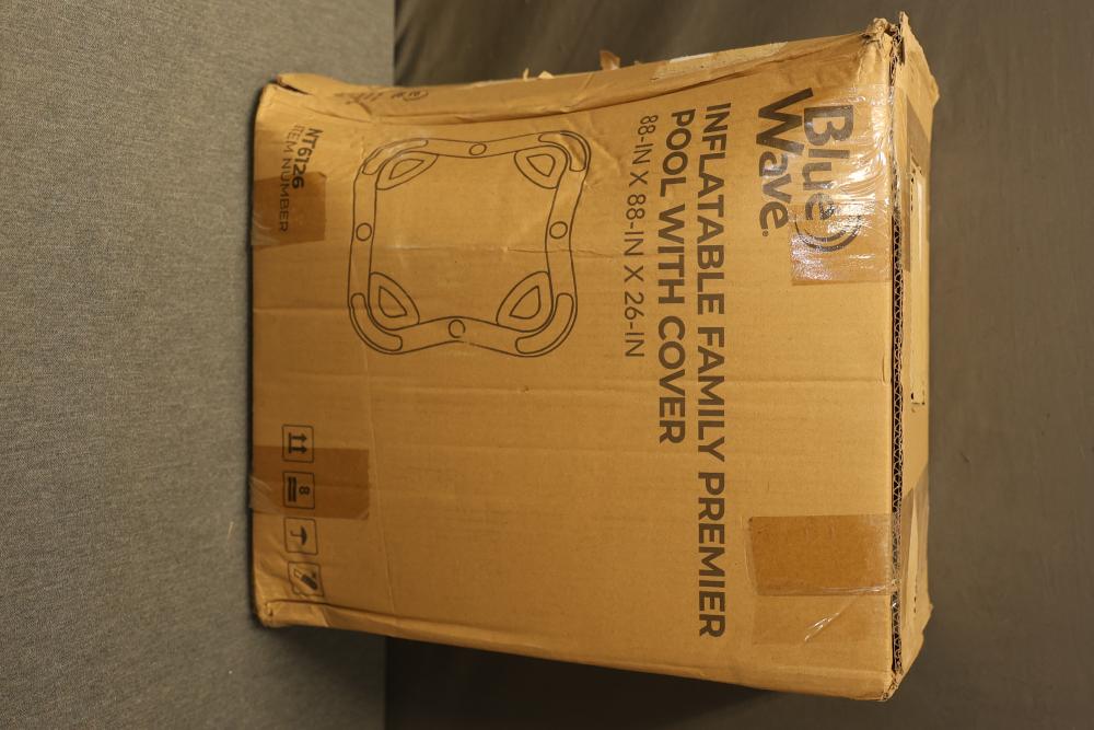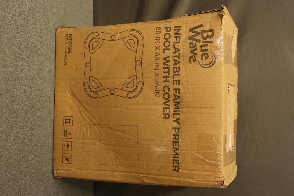 Blue Wave NT6126 Inflatable Family Premier Pool with Cover. Measures 88 inches long, 88 inches wide, and 26 inches deep. Comes in original packaging with included safety instructions visible on the box.