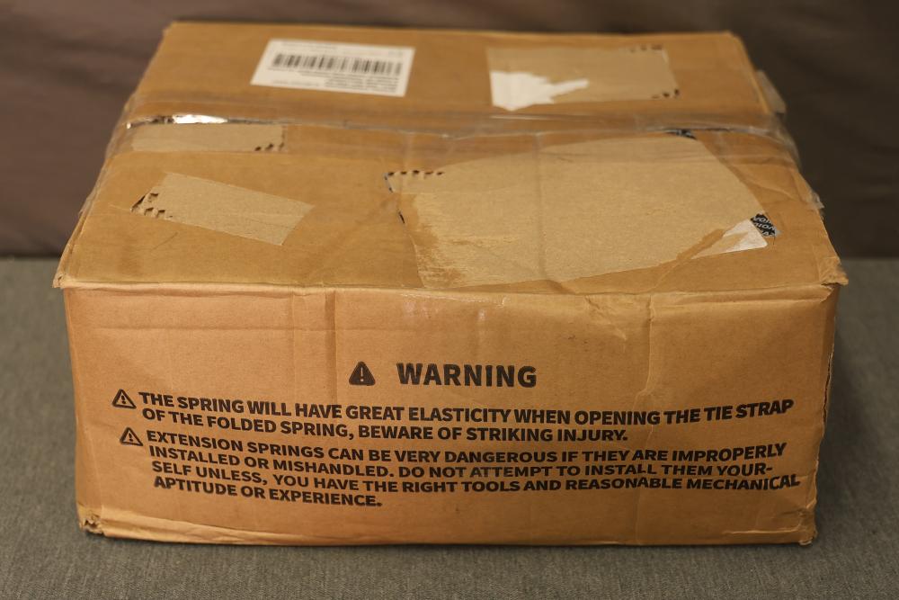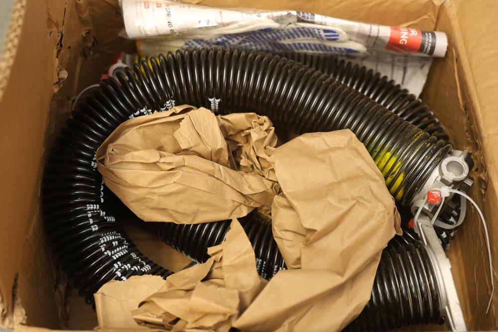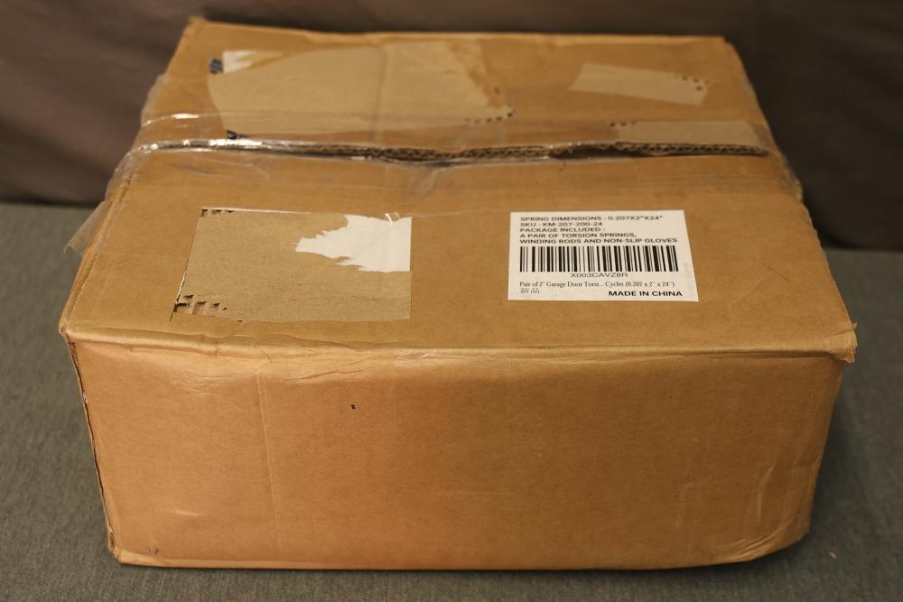 KaiMinDogz Pair of 2 inch Garage Door Torsion Springs with Winding Bars and Gloves. Springs are 24 inches long and have a wire gauge of .207. Package includes two torsion springs, winding rods, and non-slip gloves. Warning labels and safety instructions are present on the packaging for safe handling.