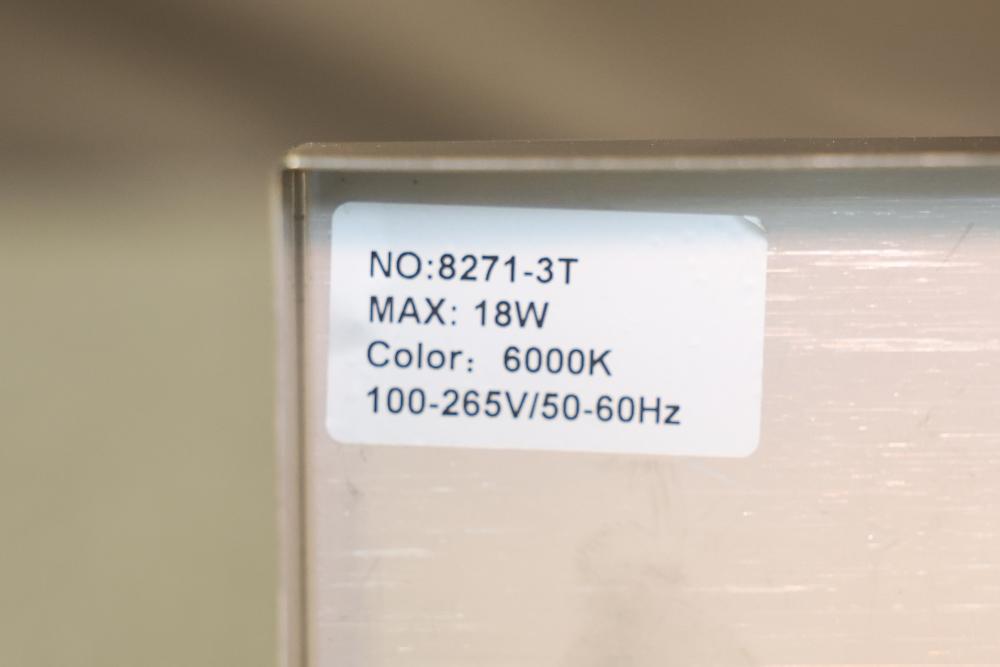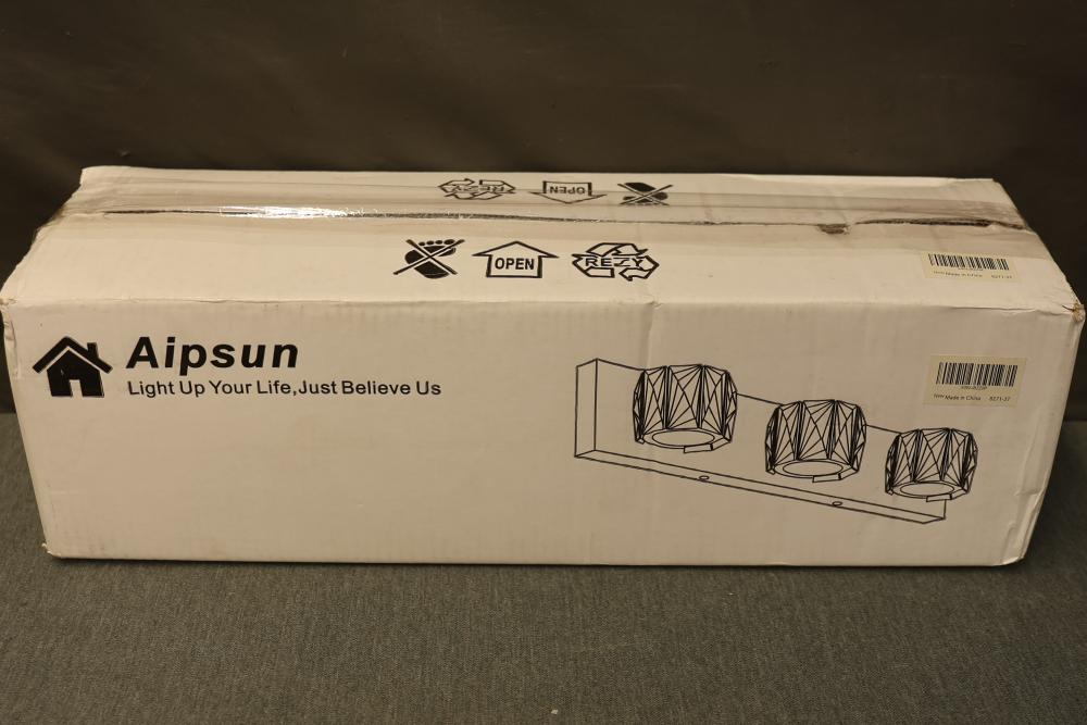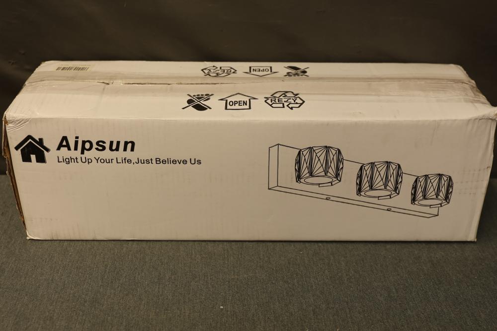 Aipsun 8271-3T 3-Light Crystal Vanity featuring a sleek design with three crystal light fixtures. Measures approximately 20.5 inches long and 4.5 inches wide. Maximum 18W, 6000K color temperature, and supports 100-265V/50-60Hz. Includes installation accessories and gloves.