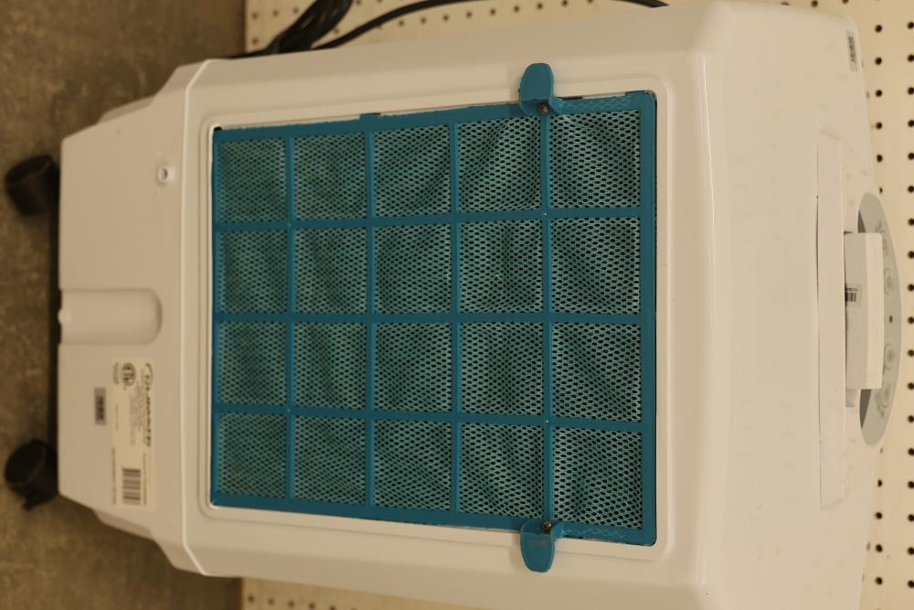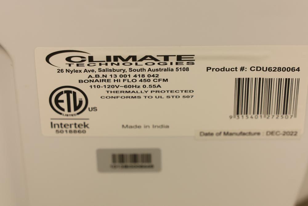 Bonaire Hi Flo 450 CFM Portable Evaporative Air Cooler with Remote, Model CDU6280064. Features adjustable control panel, a remote control, and a removable filter. 110-120 V, 60Hz, 0.55A. Includes instruction manual. Pickup only.
