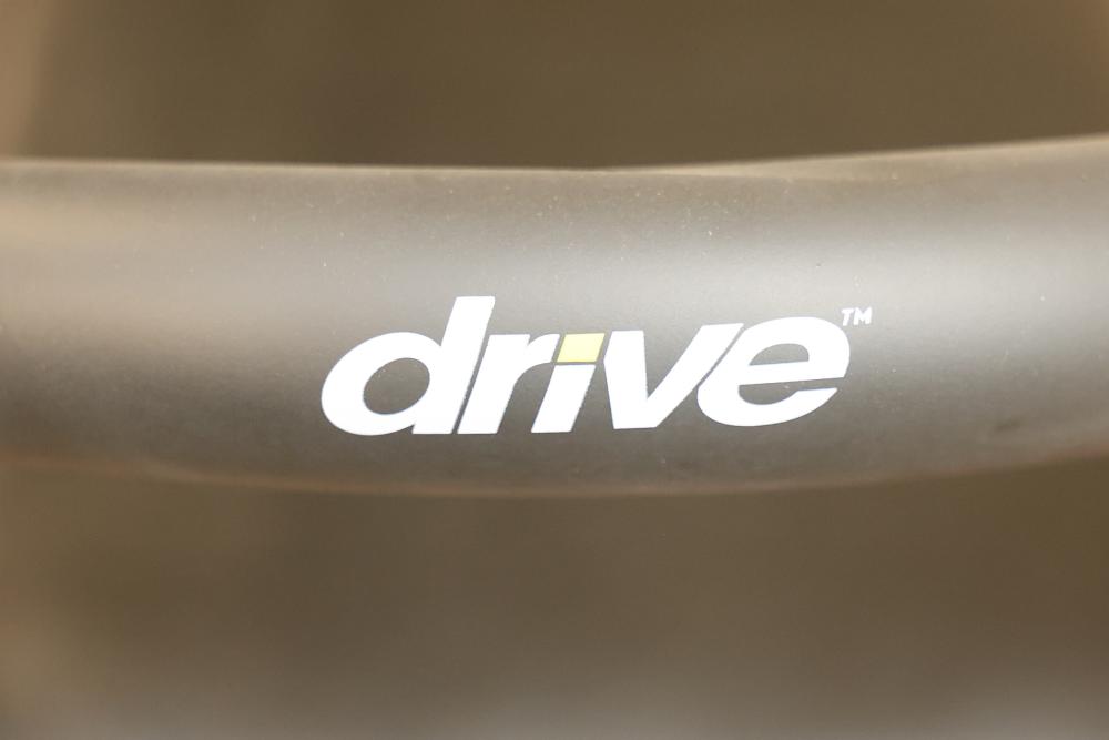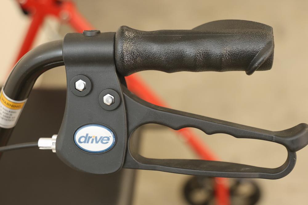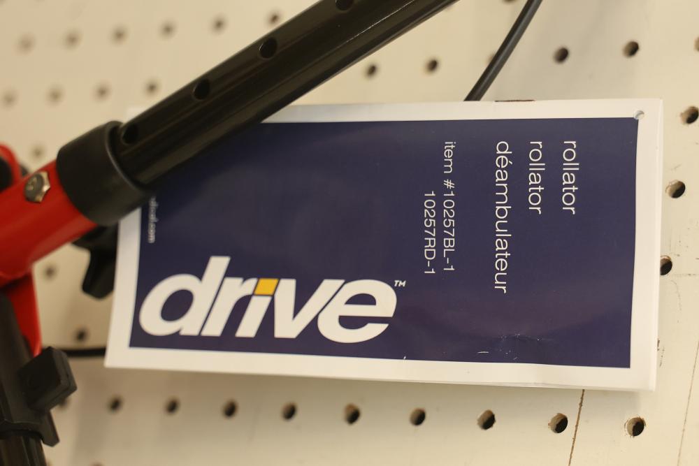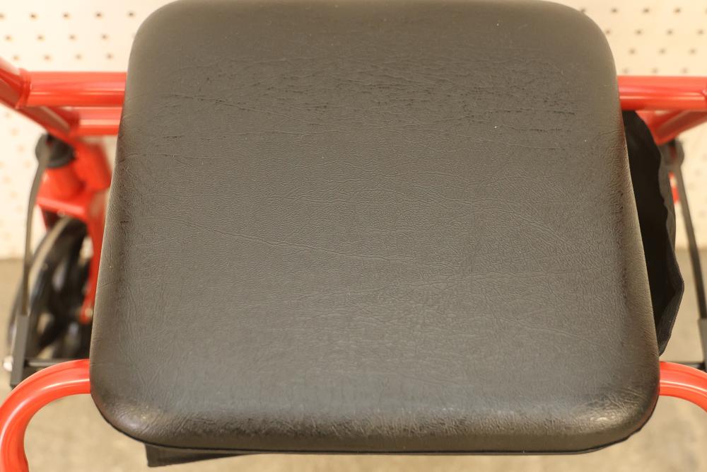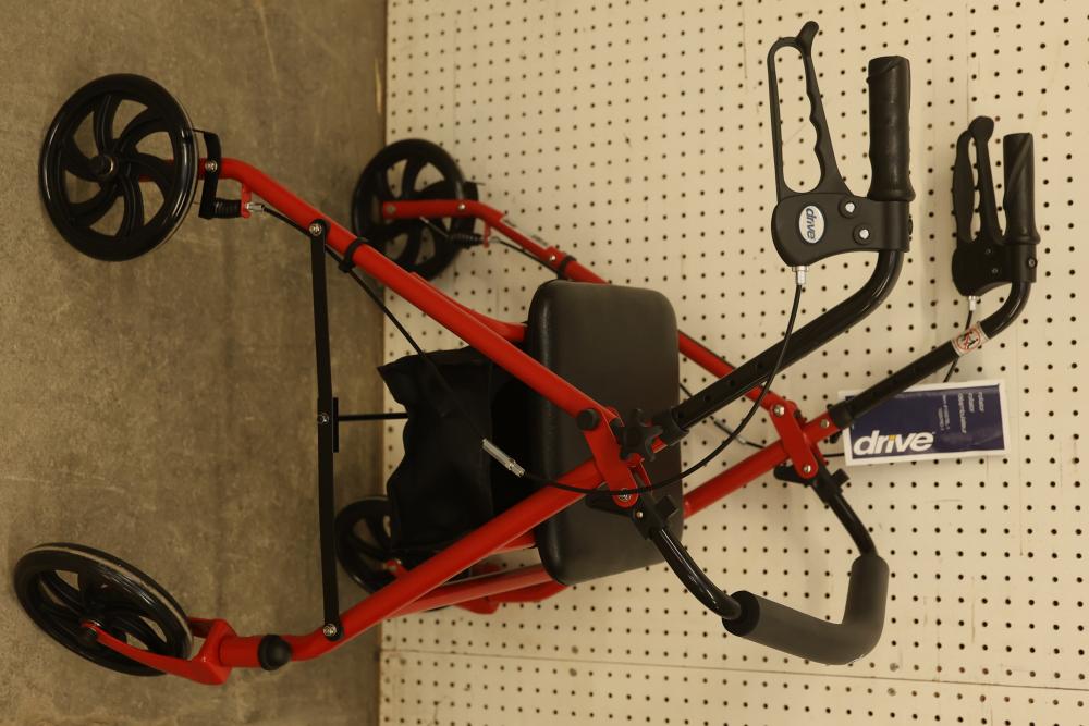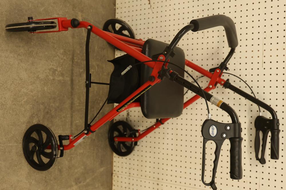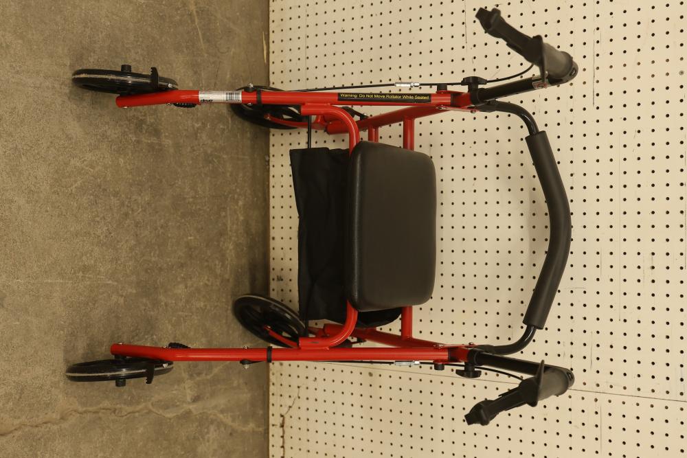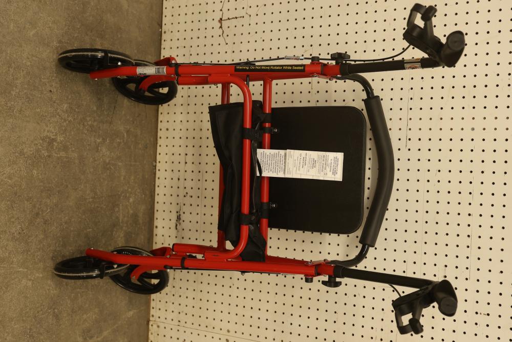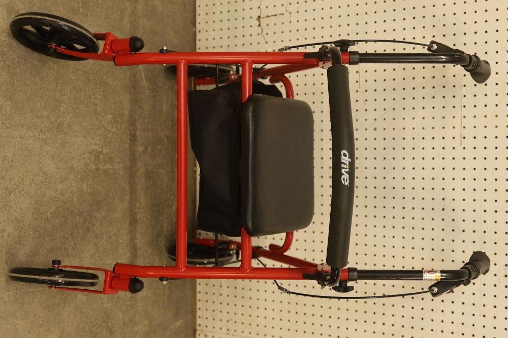 Drive 10257RD-1 Medical Rollator Walker with Seat and Underseat Storage Bag. Height adjustable, foldable, and features a durable steel frame. Finished in red, it supports up to 300 lbs. The seat measures approximately 12 inches wide, and the height ranges from approximately 31 to 35 inches. Pickup only.