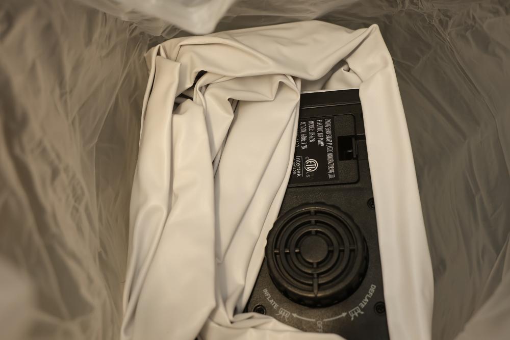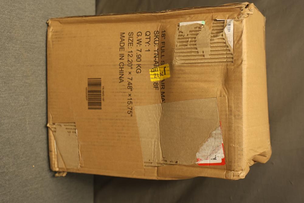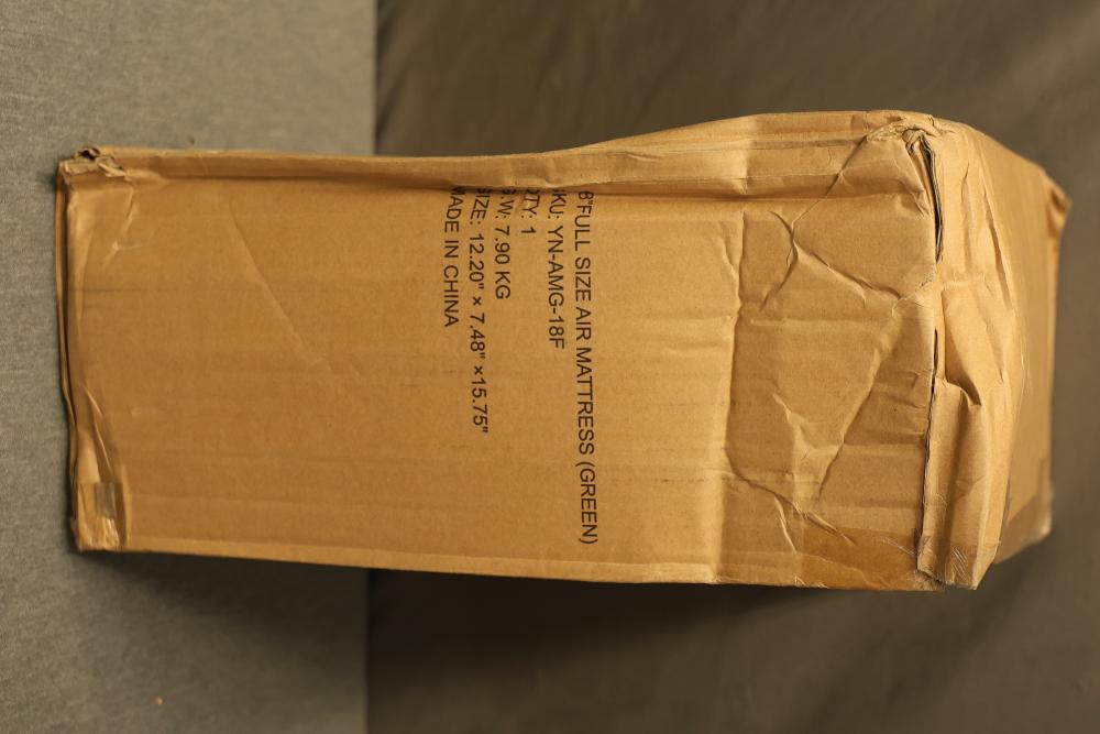 Yening YN-AMG-18F 18 Inch Full Size Air Mattress in Green. Includes built-in pump for quick inflation in approximately 3 minutes. The box shows wear with some deformities but contents appear unused. Mattress is a full-size model.