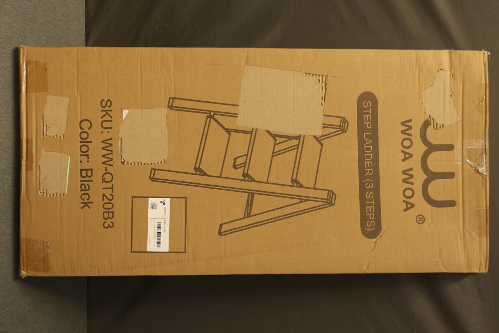 WOA WOA WW-QT20B3 3-Step Step Ladder in Black Aluminum. Ladder is foldable for easy transportation and storage and supports up to 330 lbs. Made from durable aluminum material with a compact design for efficient portability.