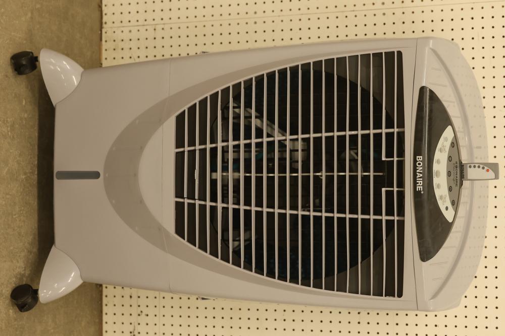 Bonaire Durango 3100 CFM Portable Evaporative Air Cooler with Remote, Model CDU6280051. Features an adjustable control panel, remote control, and removable filters. Requires 120 V, 60 Hz, 1.9A power supply. Instruction manual is not included. Pickup only.