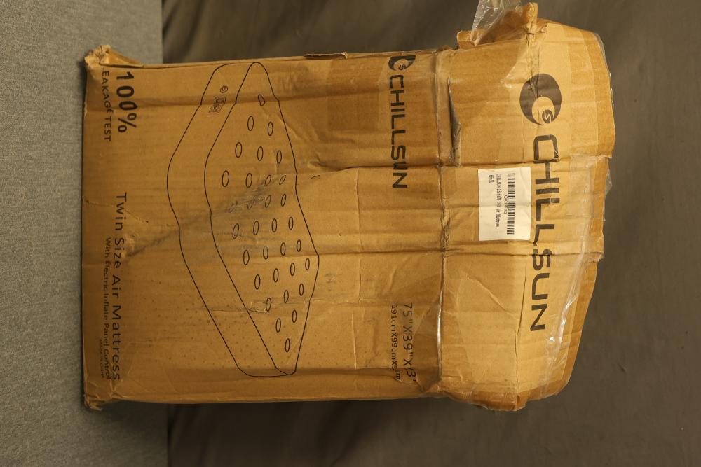 Chillsun Twin Size Air Mattress in Purple, featuring dimensions of approximately 75 inches long, 39 inches wide, and 13 inches deep. Includes an electric inflate panel control for convenient setup. The item remains in its original packaging, though the box shows visible wear.