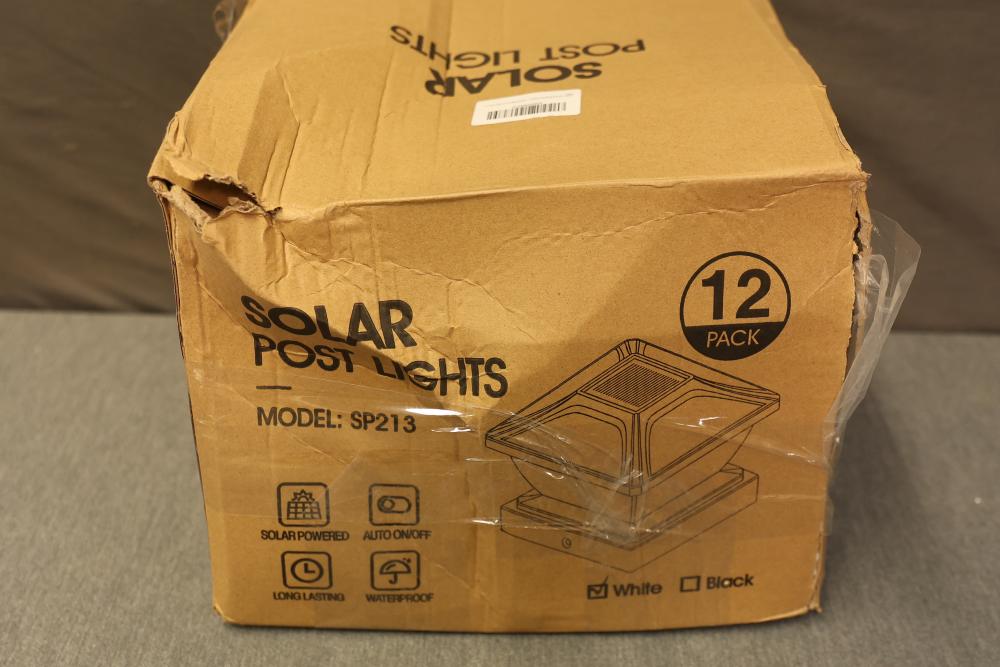 Ensli SP213 Solar Post Cap Lights with Two Lighting Modes, Quantity of 17. Features warm white and cool white lighting options. Some diffusers have cracks but lights are functional. Pickup only.