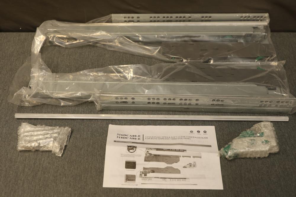 SIGOEI 316DCA80-E 3-Fold Push-Open and Soft Close Bottom Mount Concealed Slide for 16mm and 18mm Panel. Strictly fits side boards less than or equal to 5/8ths of an inch thick and will not lock on 3/4s of an inch thick sides. Includes original packaging and instructions.