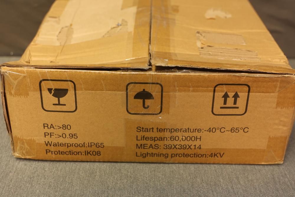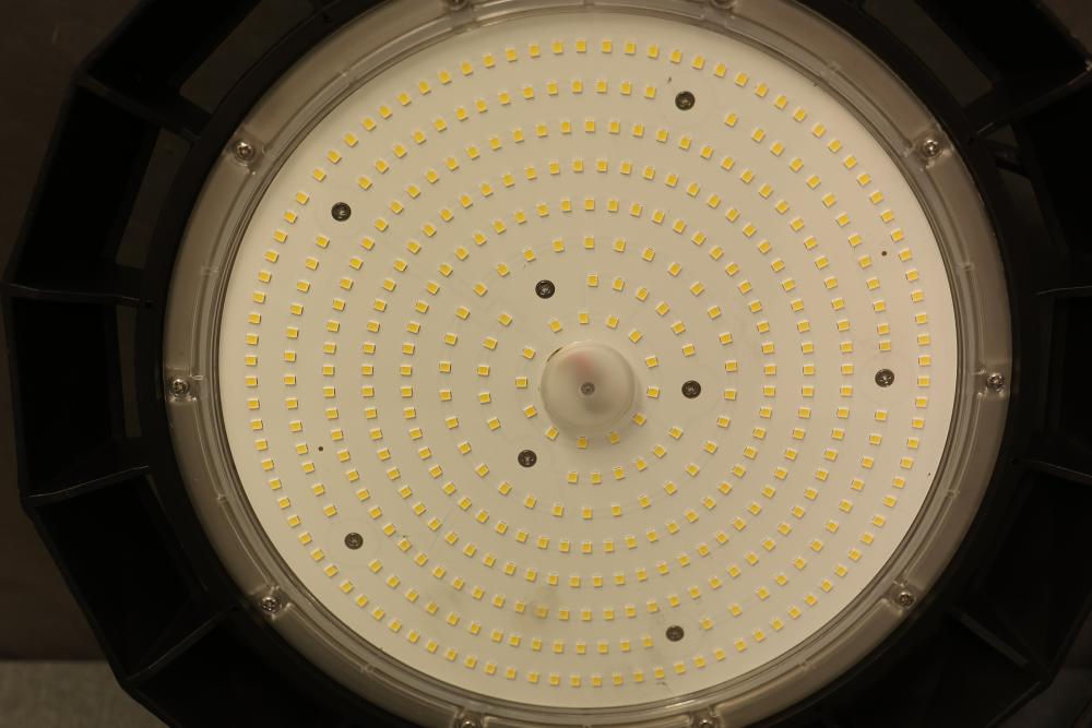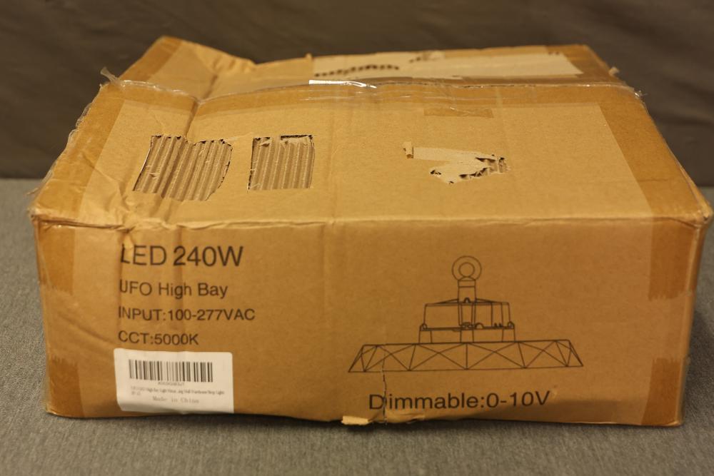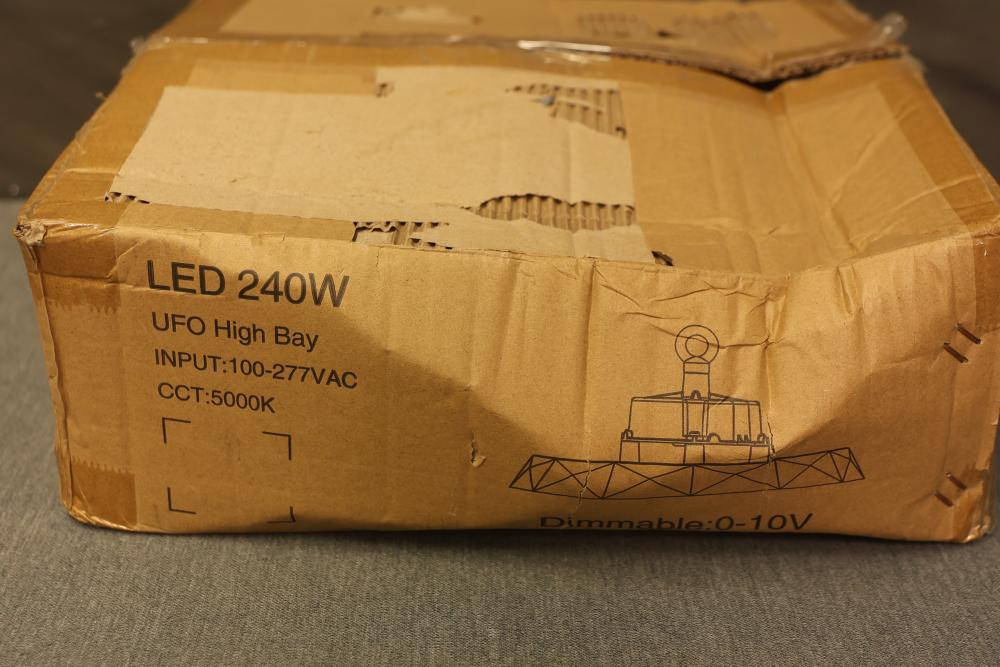 UFO LED High Bay Light Fixture, 240W, with 5000K color temperature. Includes a dimmable feature (0-10V) and IP65 waterproof rating. Light is designed for an input of 100-277VAC with over 60,000 hours of lifespan. The hook and A/C wall plug are missing. Pickup only.