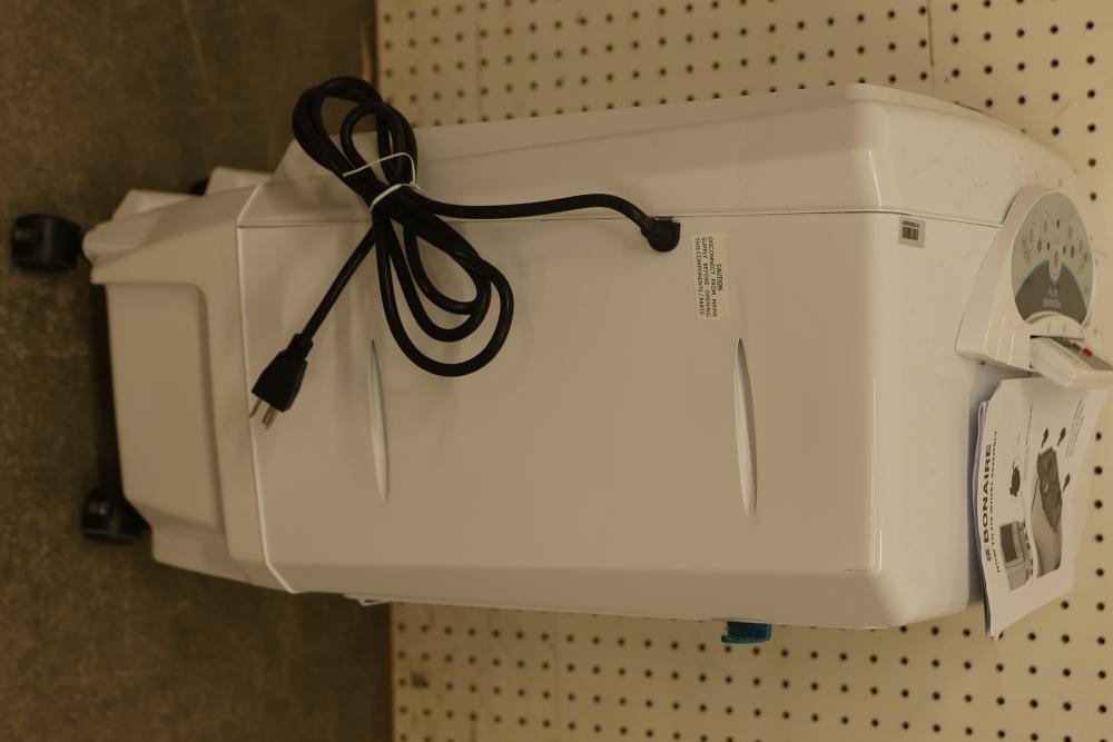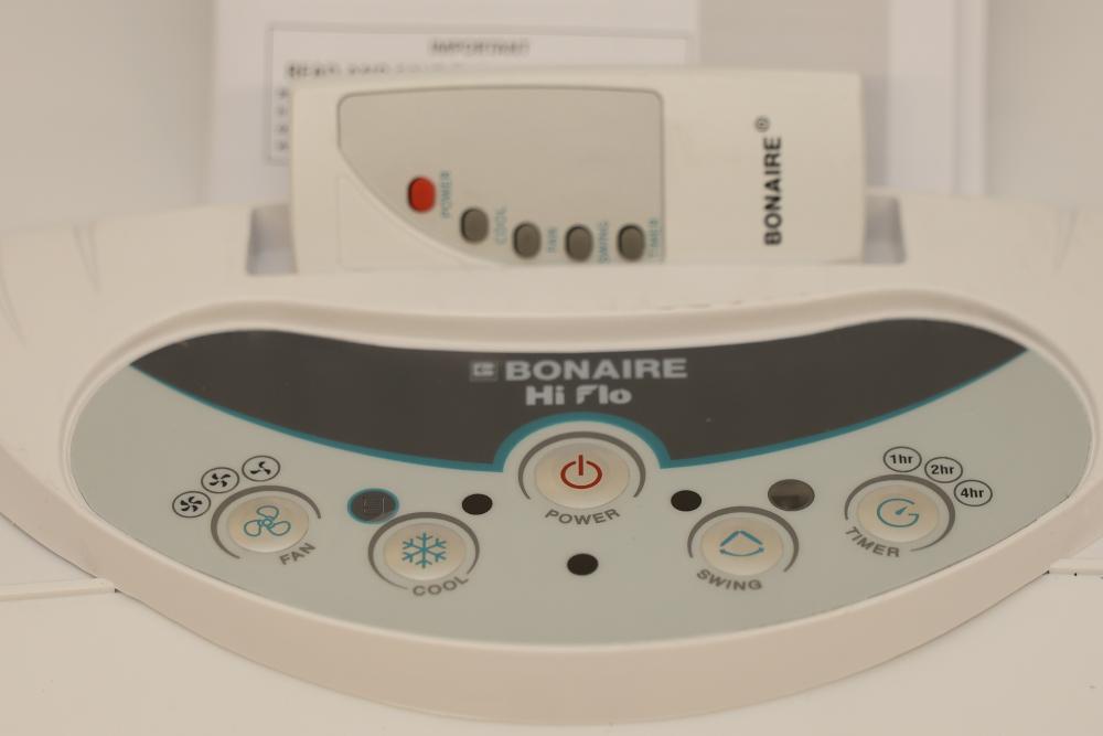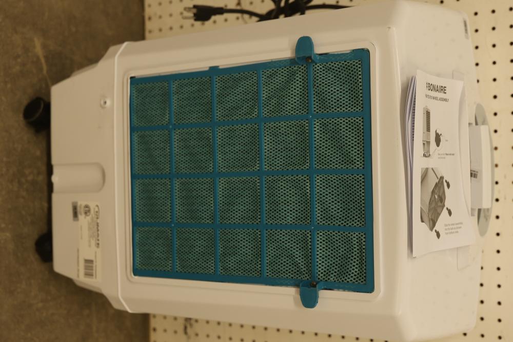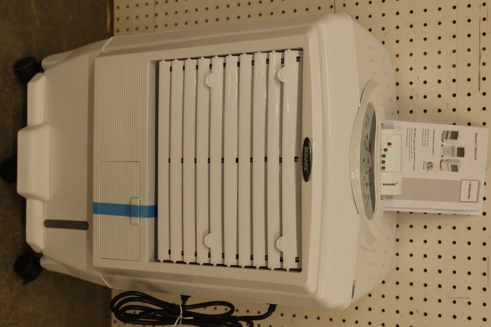 Bonaire Hi Flo 450 CFM Portable Evaporative Air Cooler, Model CDU6280064. Features an adjustable control panel, a remote control, and a removable filter. Includes instruction manual. Specifications: 110-120 V, 60Hz, 0.55A. Pickup only.