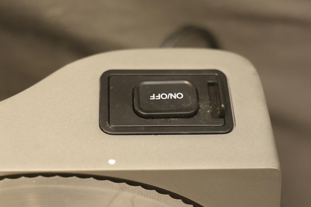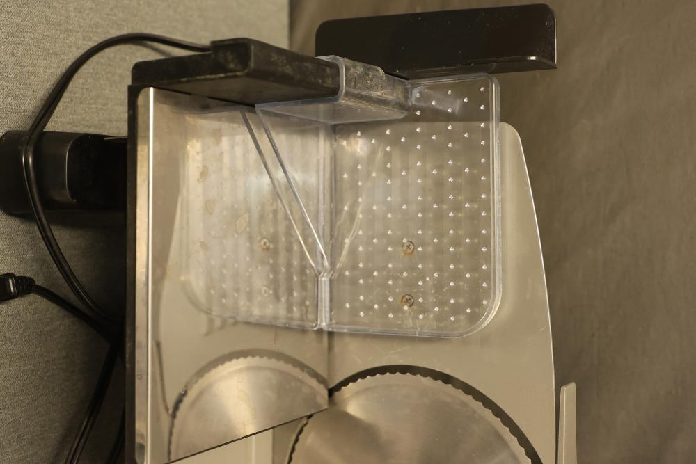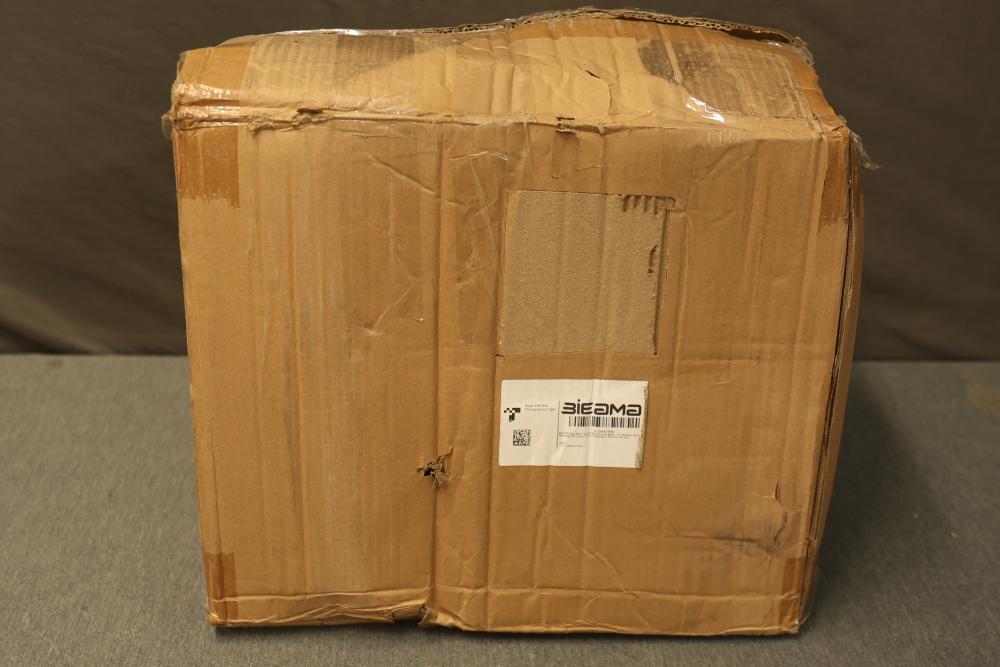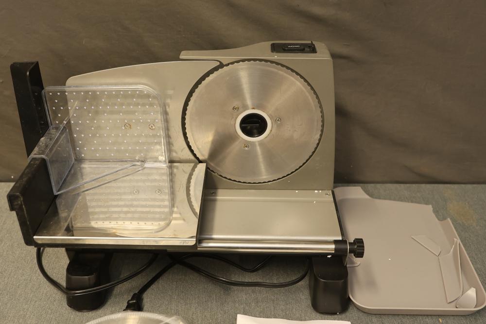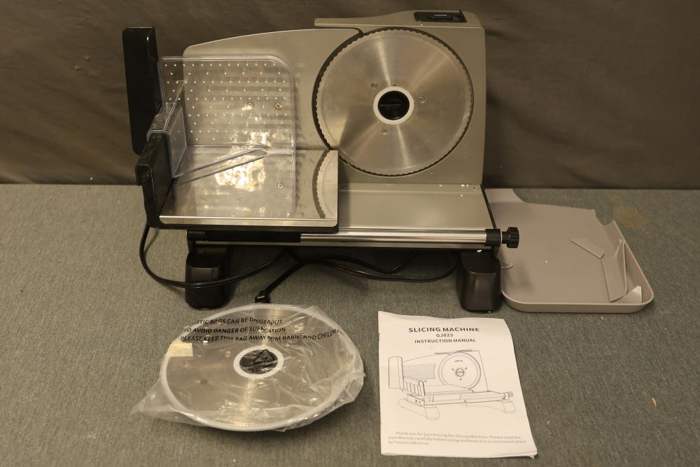 Bieama GJ823 Electric Deli and Meat Slicer with Adjustable Thickness. Includes 2 removable 7.5-inch stainless steel blades and instruction manual. Food plate is cracked, and the item shows signs of previous use. Original packaging is present but shows wear and damage.