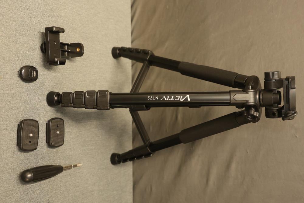 Victiv NT72 and T72 72 Inch Portable Tripods with Accessories. The NT72 tripod includes one remote, one phone holder, and one quick release plate. The T72 tripod includes one remote, one phone holder, and two quick release plates. Both come with carrying bags for transportation and storage.