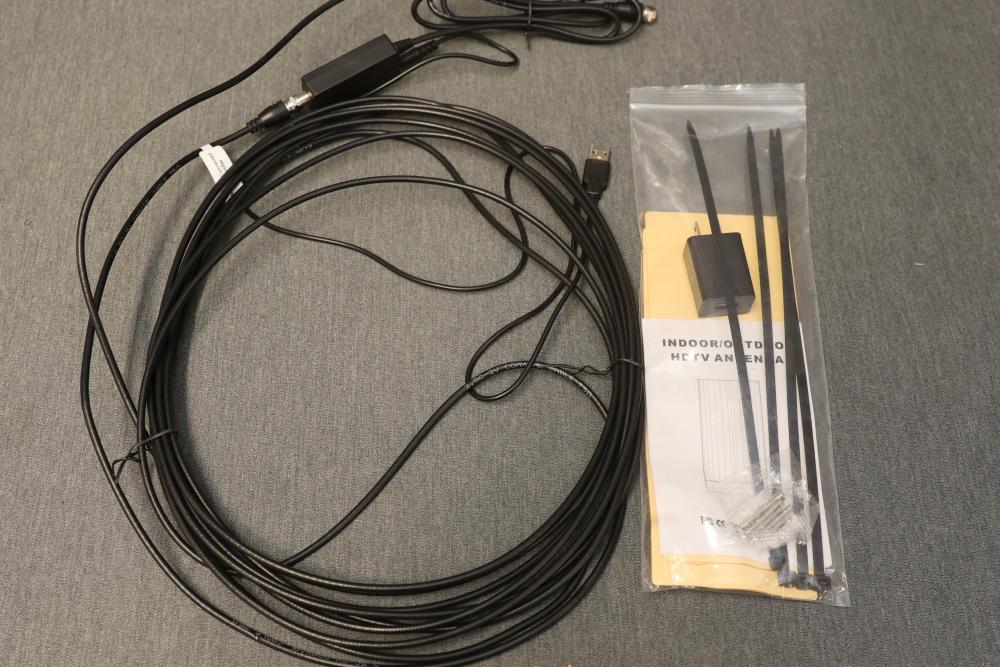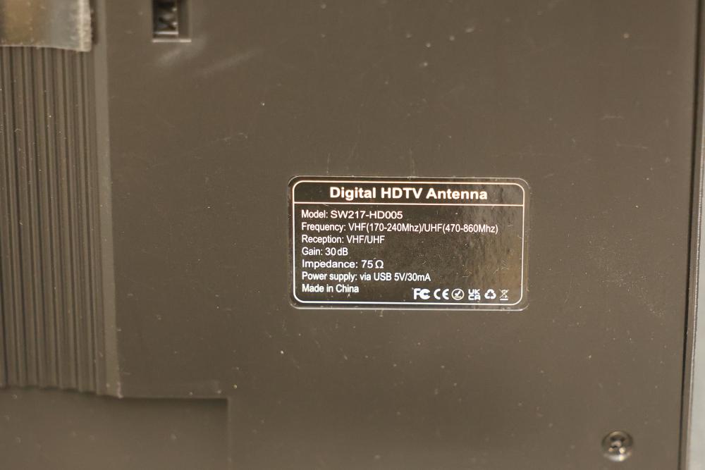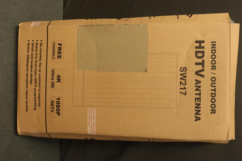 Indoor Outdoor Digital HDTV Antenna, Model SW217-HD005. Supports 1080p HDTV, 4K, and Ultra HD resolution. Features include VHF/UHF reception, 30 dB gain, and USB power supply (5V/30mA). Includes necessary cables and installation accessories.