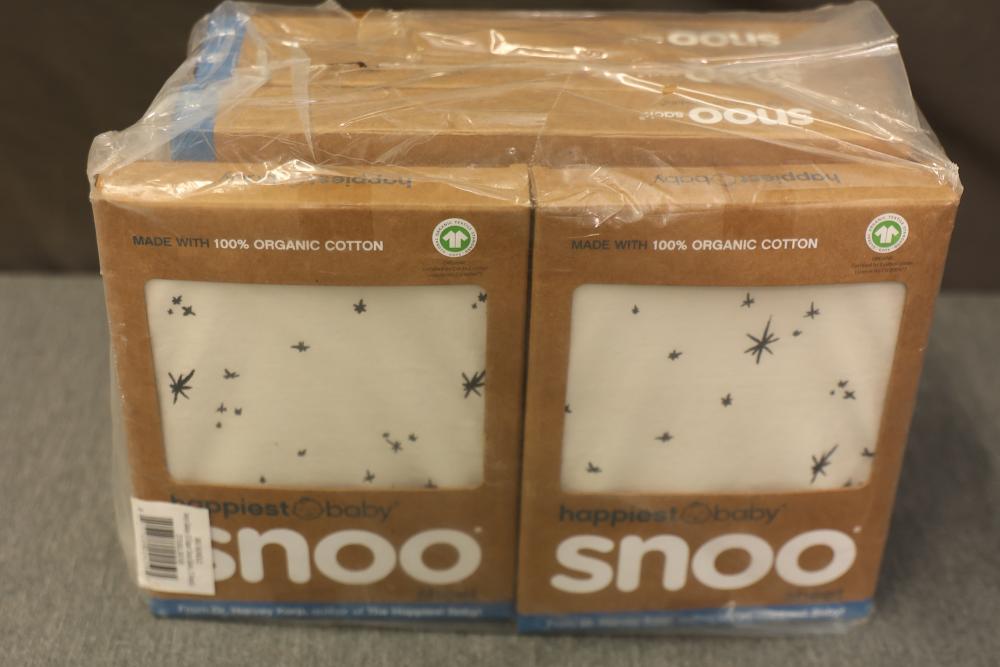 Cosco Onlook 2-In-1 Convertible Car Seat, SNOO Happiest Baby Big Bundle, and Yatytepo Wipe Warmer and Baby Wipe Dispenser. The car seat is missing the base. The SNOO Big Bundle includes 3 SNOO sacks in sizes small, medium, and large, along with 2 SNOO bassinet fitted sheets in the Ivory Galaxy design.