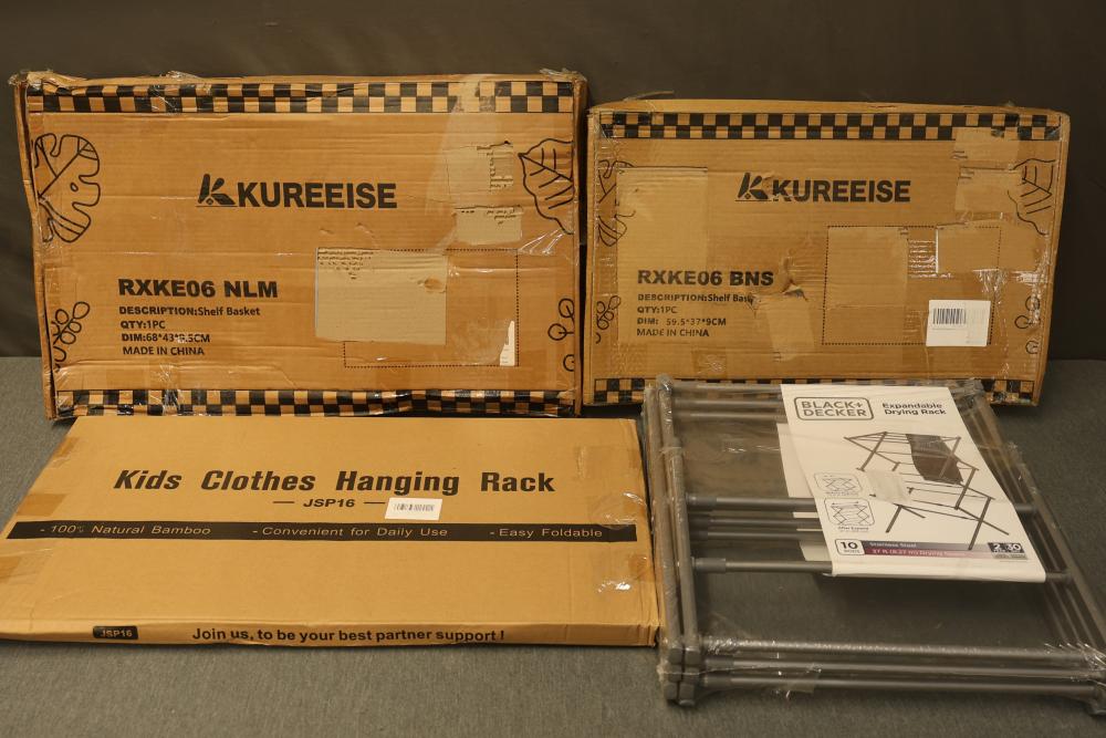 KUREEISE 105 L handwoven rattan storage basket with 2 separate lids, measuring 16.1 inches high, 25.2 inches wide, and 15.4 inches deep. KUREEISE 65 L rattan basket with cotton liner and handles, measuring 13.8 inches high, 22 inches wide, and 13 inches deep. Jotsport JSP16 1-tier bamboo clothes rack for kids. Black and Decker stainless steel expandable clothes drying rack.
