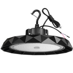 UFO LED High Bay Light Fixture, 240W, with 5000K color temperature. Includes a dimmable feature (0-10V) and IP65 waterproof rating. Light is designed for an input of 100-277VAC with over 60,000 hours of lifespan. The hook and A/C wall plug are missing. Pickup only.