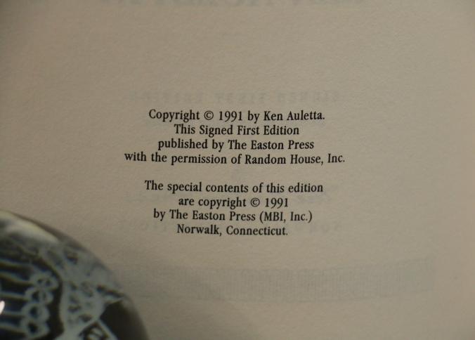 Three Blind Mice' Leatherbound First Edition Personally Signed by Ken Auletta.This edition features leather binding with gold leaf accents, a ribbon marker, and gold leaf-edged pages. Includes the author's personal signature on a dedicated page. Copyright 1991 by The Easton Press.