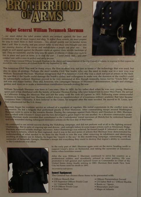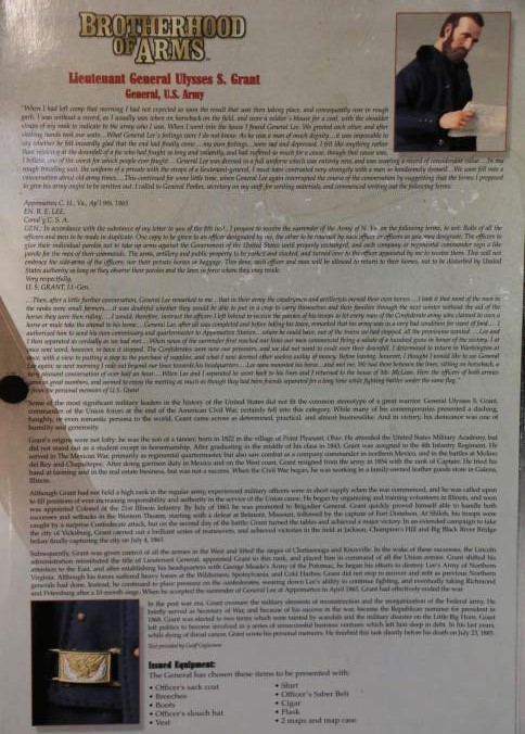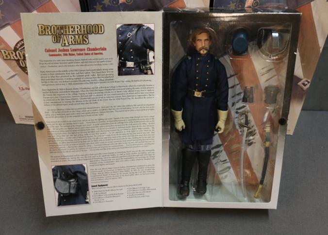 Five Brotherhood of Arms action figures depicting Union Generals and Infantryman. Includes boxed action figures: General Joshua Lawrence Chamberlain, General William T. Sherman, President Abraham Lincoln, a soldier from the 2nd Wisconsin Volunteer Infantry Iron Brigade, and General Ulysses S. Grant. Each figure is accompanied by themed accessories, attire, and historical documentation.