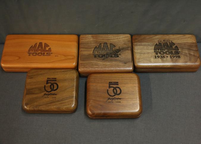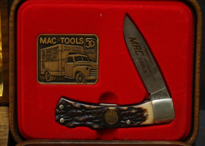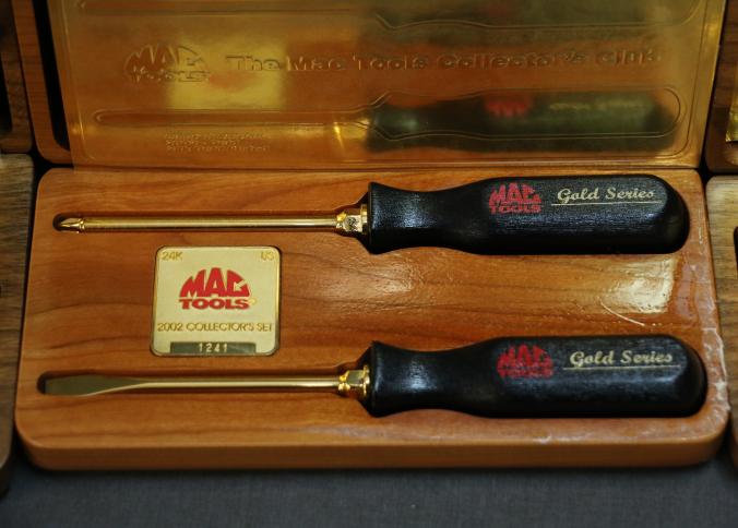 Mac Tools 24K Gold-Plated Limited Edition Gift Sets in Wooden Display Cases. Features include socket sets and screwdrivers with 24K gold-plated components, accompanied by two commemorative pocket knives with etched blades and plaques.