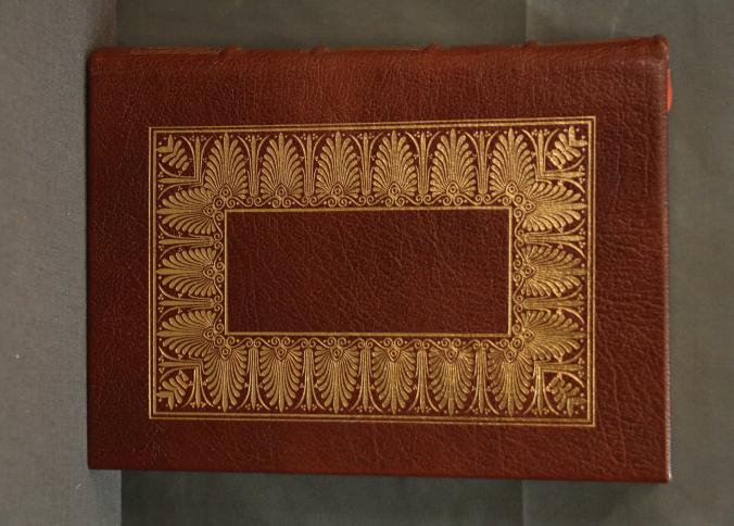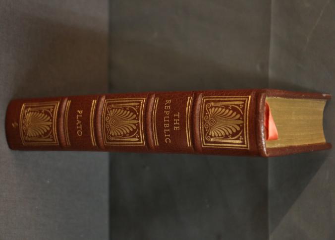 The Republic' Leatherbound Edition by Plato, featuring a leather cover with intricate gold-tone embossed designs on the spine and covers. Includes illustrations, gold leaf page edges, and a built-in red ribbon bookmark. Published by The Easton Press and copyrighted 1970 with translated text by Benjamin Jowett.