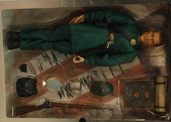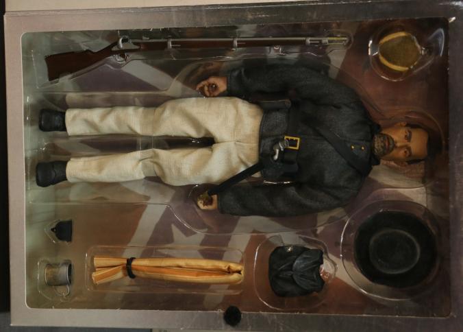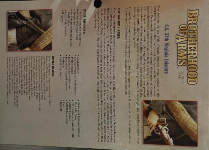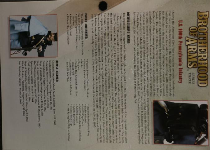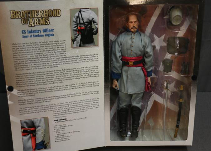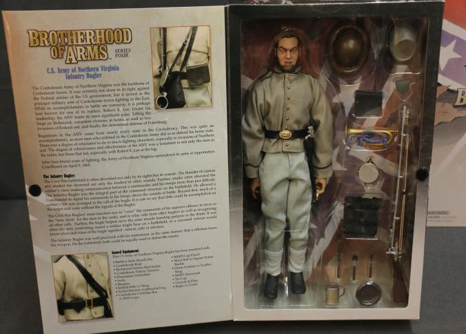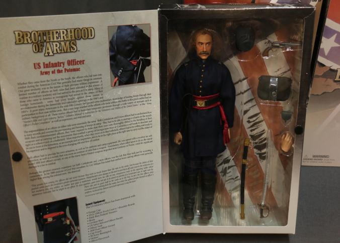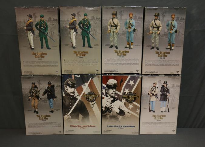Brotherhood of Arms U.S. and C.S. military figures set featuring multiple figures, each with detailed uniforms, issued equipment, and accessories. Figures include sharpshooters, infantry officers, and specialized units. Each box includes historical background and battle honors of the depicted units.