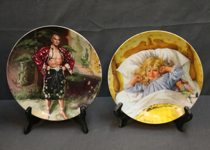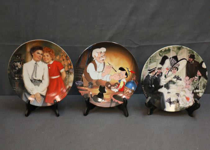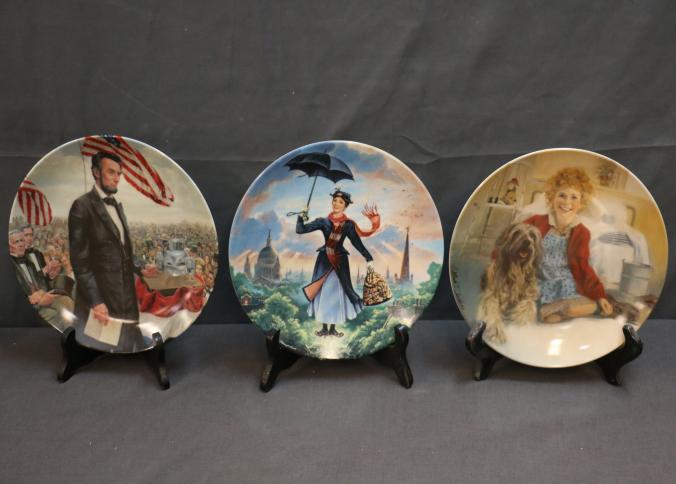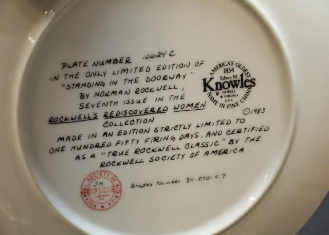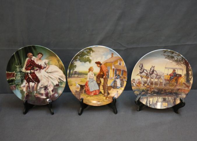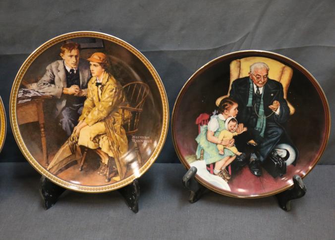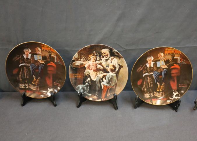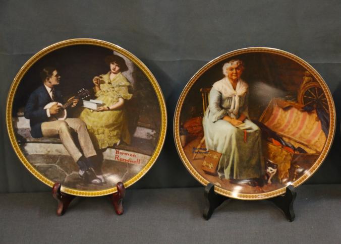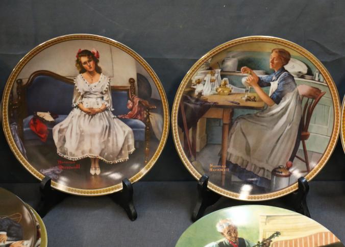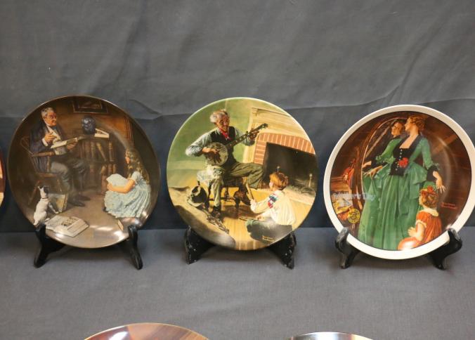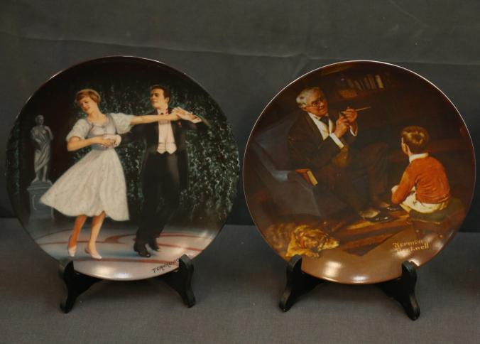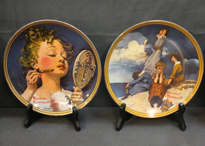 Norman Rockwell and Edwin M. Knowles Limited Edition Plates featuring artwork such as 'Scarlett and Rhett,' 'The Gourmet,' 'Awakening,' and others. Some pieces have decorative gold-tone trims. Includes a variety of illustrated themes. Pickup only.