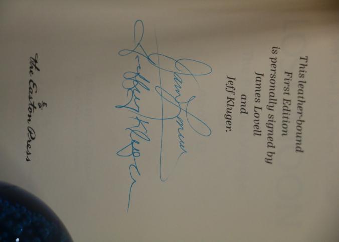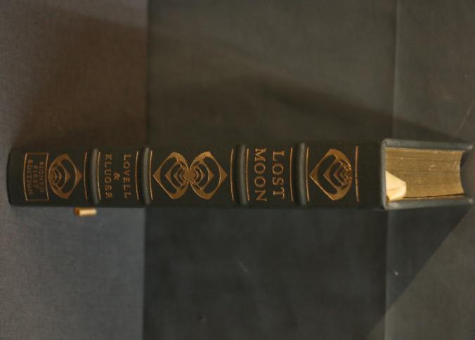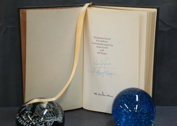 Signed First Edition 'Lost Moon' by Lovell and Kluger. Leather-bound book featuring gold leaf accents, a ribbon marker, and gold leaf page edges. Includes illustrations and the iconic Apollo XIII emblem. Personally signed by James Lovell and Jeffrey Kluger. Published by The Easton Press with permission from Houghton Mifflin Company and copyrighted 1989.