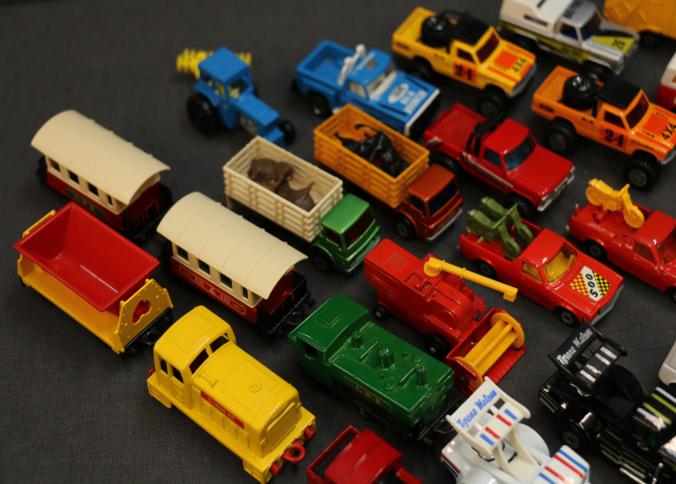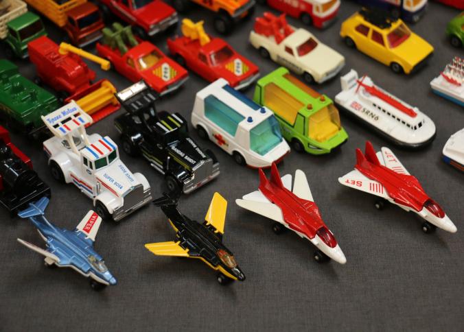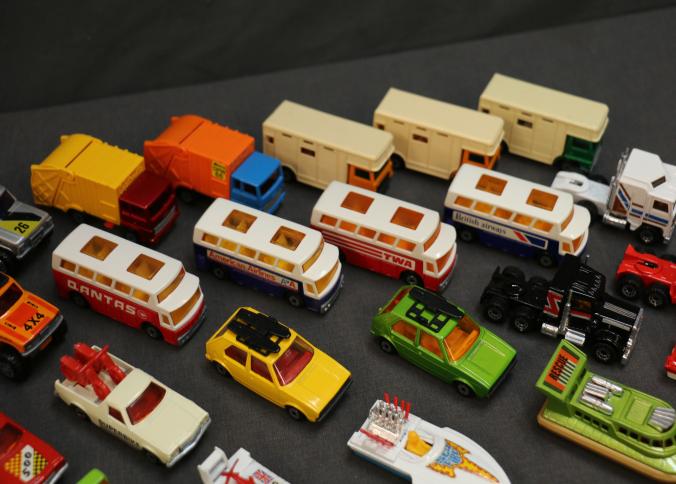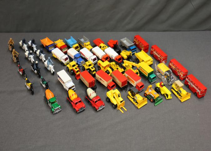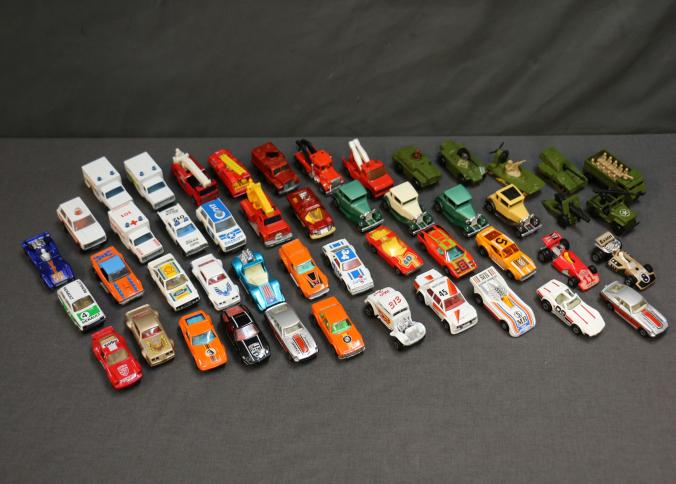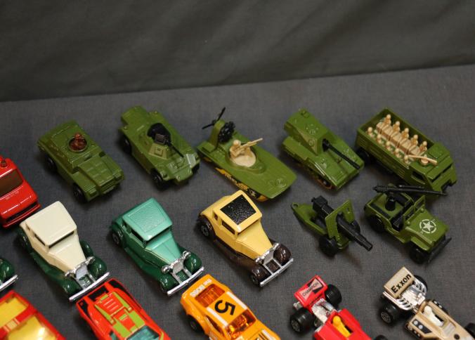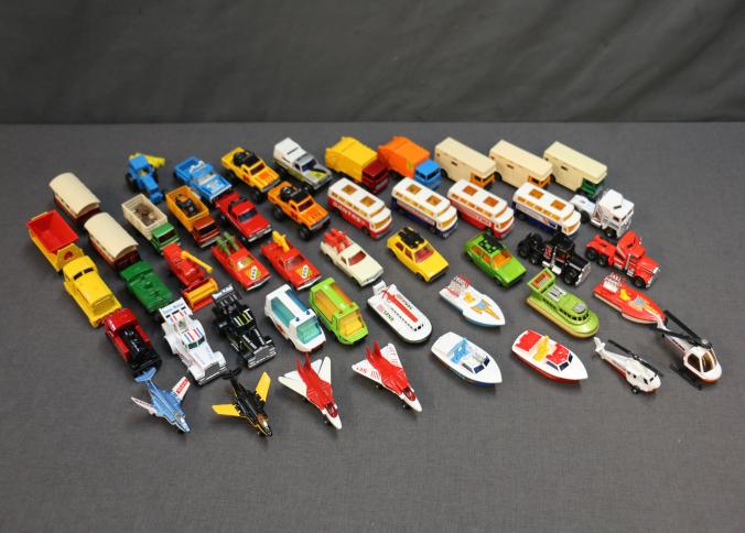 Matchbox Die-Cast Model Cars, Trucks, Motorcycles, and Aircraft, featuring a diverse range of vehicles including cars, trucks, military models, emergency vehicles, motorcycles, boats, and planes. Includes storage.