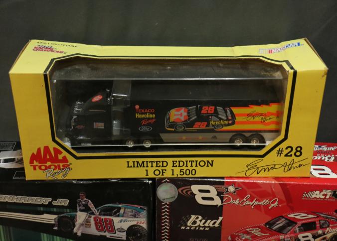 Die-Cast Race Car Models and Collectibles with Limited Editions, including Team Convoy Goodwrench Racing, Sunoco Toy Tanker Truck, Davey Allison Champion Forever models, Mac Tools Racing, and various branded 1:24 and 1:64 scale race cars. Includes limited-edition models such as Dale Earnhardt Jr.'s cars and several team haulers. Pickup only.