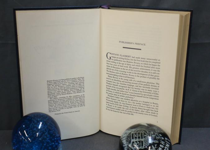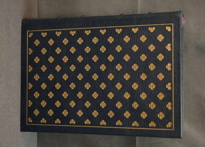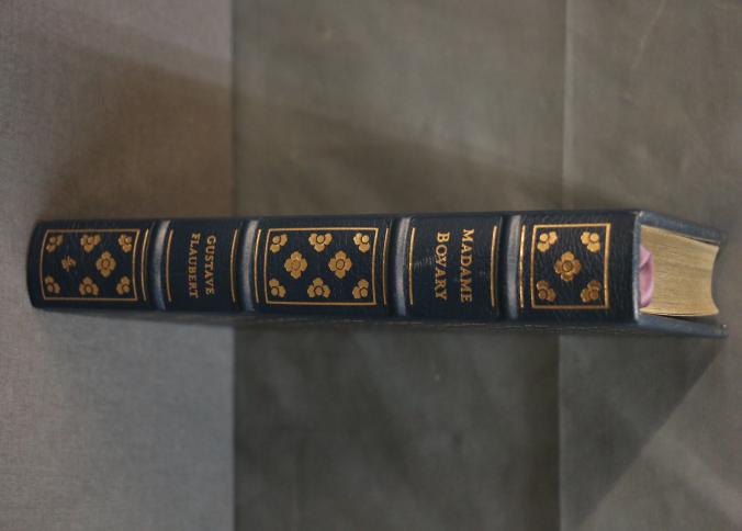 Madame Bovary by Gustave Flaubert, Easton Press Collector's Edition, bound in dark leather with gold leaf decoration and lettering on the cover and spine. Features gold leaf-edged pages, satin ribbon marker, and wood engravings by Theo Schmied. Includes an introduction by Jacques de Lacretelle, translated by J. Lewis May. Copyright 1978 by The Easton Press.