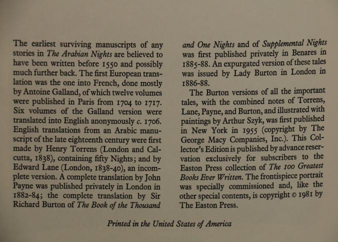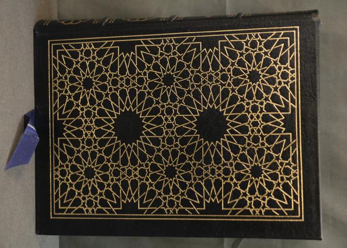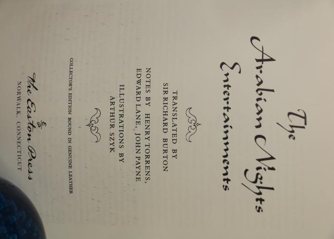 The Arabian Nights Entertainments Leather-Bound Easton Press Edition. Translated by Sir Richard Burton with notes by Henry Torrens, Edward Lane, and John Payne and illustrations by Arthur Szyk. This collector's edition is bound in genuine leather with intricate gold-tone embossed designs on the cover and spine. Includes gold leaf page edges and a satin bookmark ribbon. Copyright 1981 by The Easton Press.