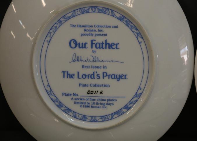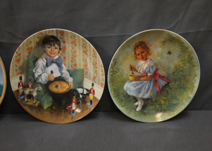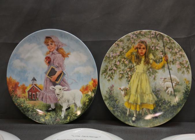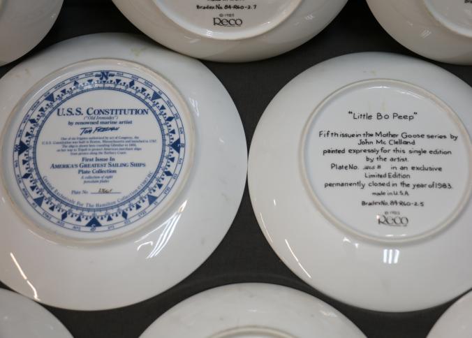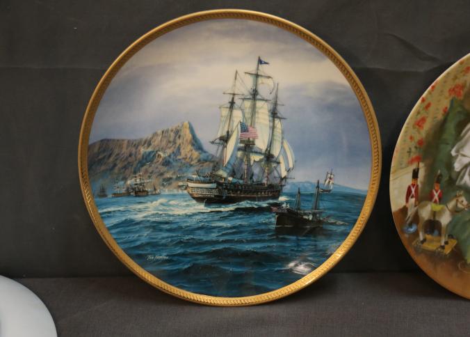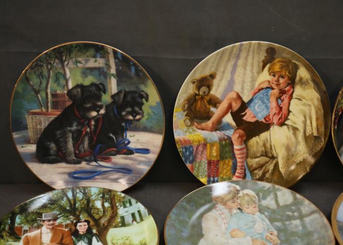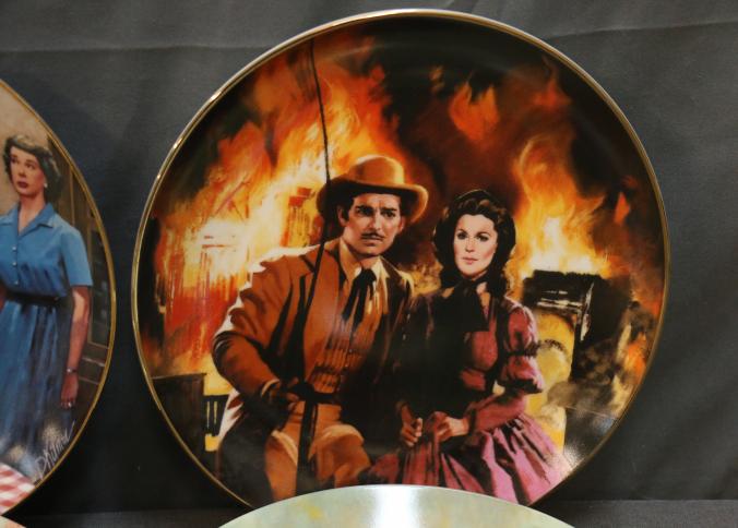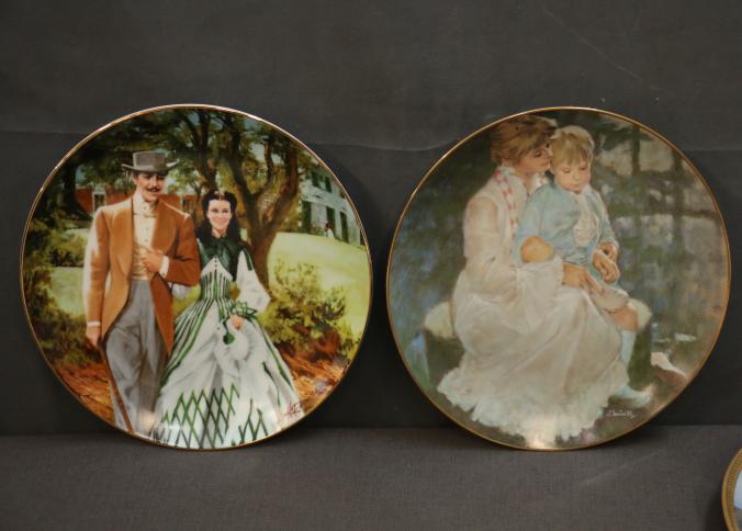 14 decorative collector plates featuring various scenes from literature, art, and historical themes. Plates include works from The Hamilton Collection, Reco, and similar makers, with titles such as 'Scarlett and Rhett Butler,' 'The Honeymooners,' 'U.S.S Constitution,' 'Little Bo Peep,' and more. Pickup only.