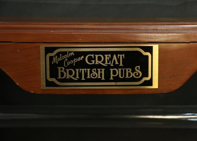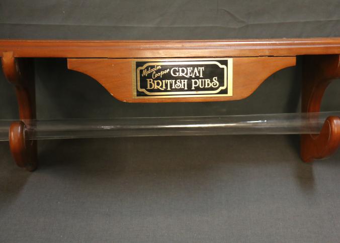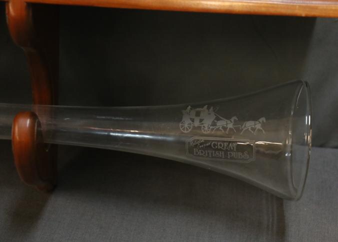 Malcolm Cooper Great British Pubs Yard of Ale Glass With Wooden Wall Mount. Featuring a clear yard of ale glass etched with a classic stagecoach motif and the brand name, the piece is displayed on a wooden mount with a brass plaque. Distinct wooden brackets support the glass, designed for wall installation. Pickup only.