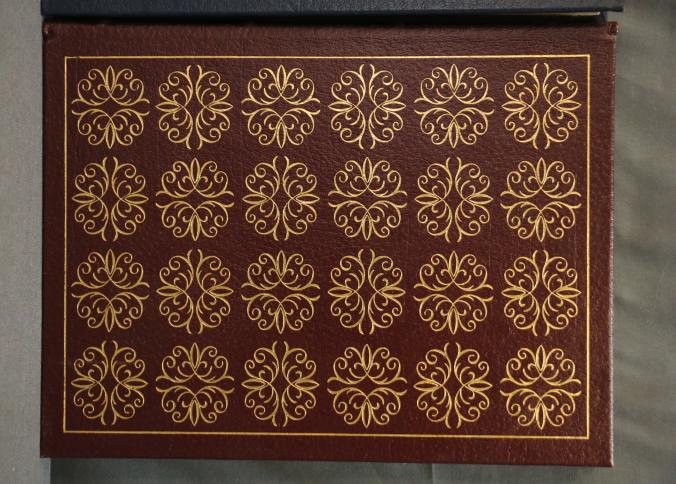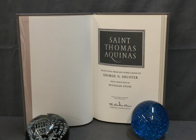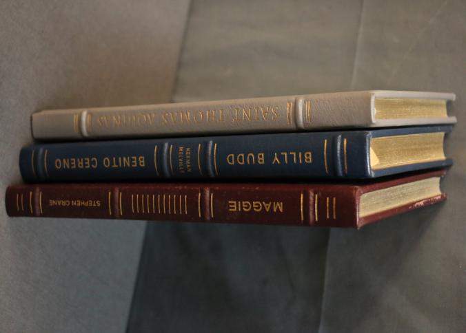 Easton Press Leather-Bound Book Set: Saint Thomas Aquinas, Billy Budd and Benito Cereno, Maggie. This set features three leather-bound editions with gold leaf-edged pages, decorative covers, and illustrations throughout. Each book is part of collector's editions published by The Easton Press with copyright dates ranging from 1965 to 1985.