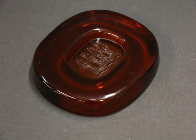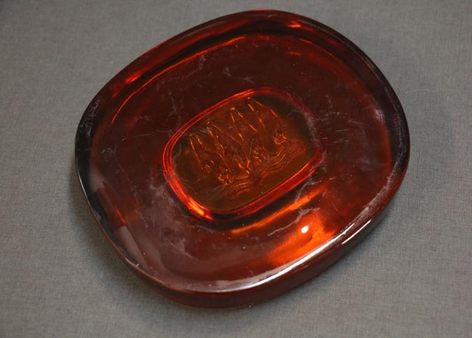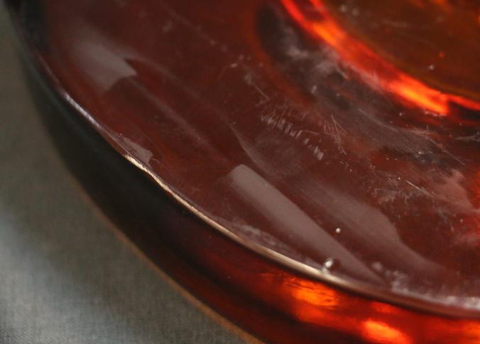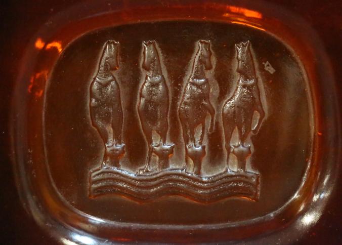 Believed to be Murano Glass Tray With Horse Design in center. Made of amber-hued glass, this tray features a central design depicting four standing horses. The surface shows wear and small scratches from previous use. Pickup only.