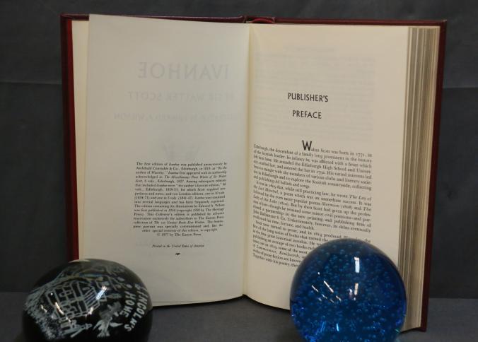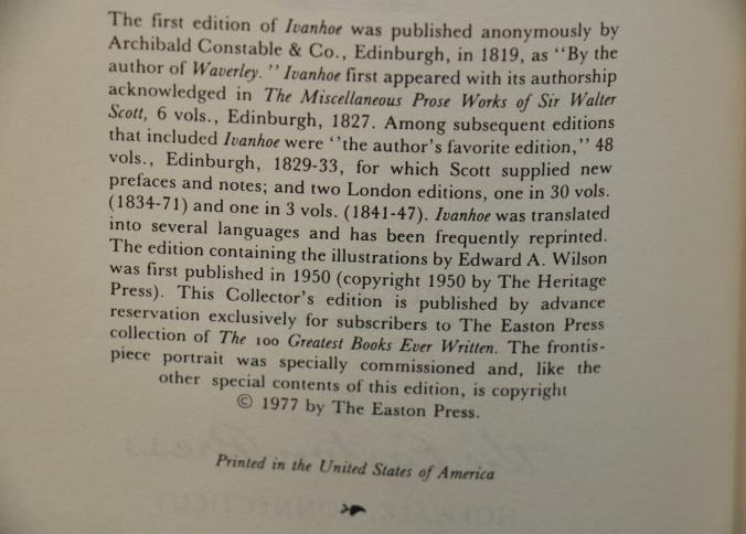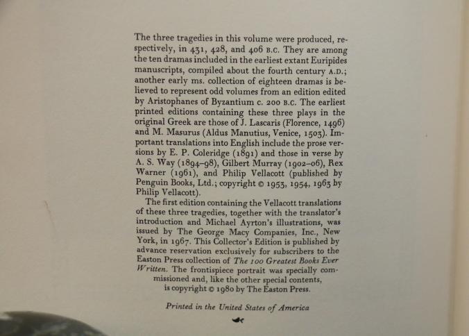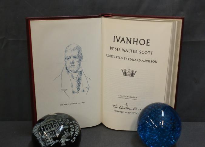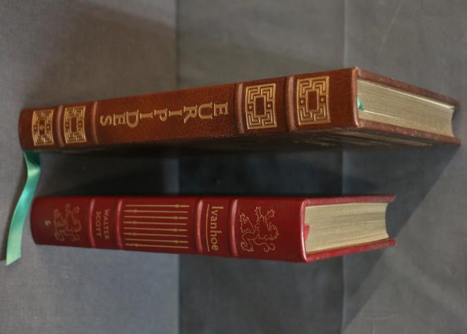 Easton Press Leather-Bound Editions: Euripides and Ivanhoe. Includes 'Medea, Hippolytus, The Bacchae' by Euripides, translated by Philip Vellacott with illustrations by Michael Ayrton, and 'Ivanhoe' by Sir Walter Scott, illustrated by Edward A. Wilson. Both volumes are collector's editions bound in genuine leather with gold leaf detailing and ribbon markers. Copyright 1977 and 1980 by The Easton Press.