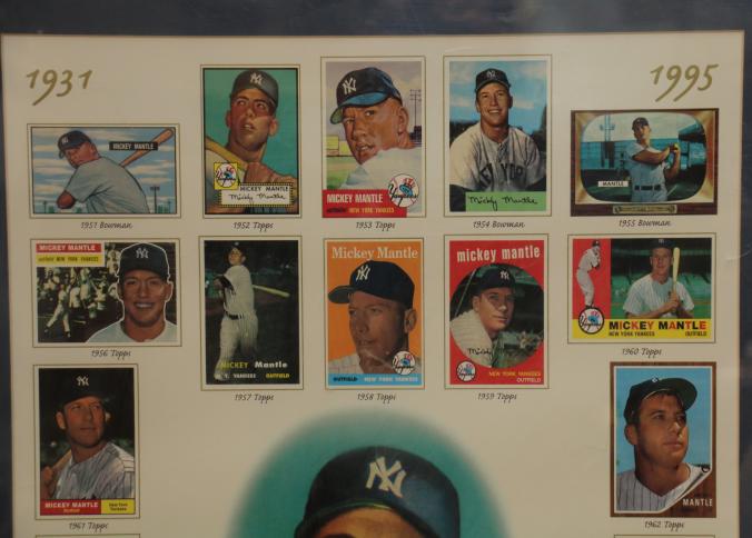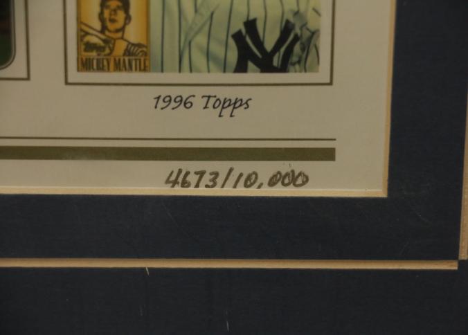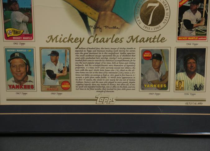 Framed Mickey Mantle Tribute with Limited Edition Number includes artwork commemorating the legendary baseball player. The piece showcases a combination of images and statistics celebrating his career, with multiple Topps and Bowman card reproductions. Edition number 4673/10,000. Pickup only.