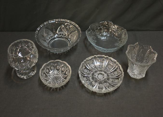 Six Clear Glass Serving and Decorative Bowls. Includes a variety of clear glass designs, including bowls, a footed vessel, and a flared vase with textured and patterned details. Ideal for serving or as decorative pieces. Pickup only.
