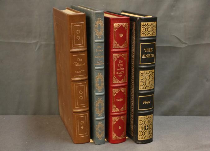 Easton Press Collector's Editions of Four Classic Literary Works. Includes 'The Talisman' by Sir Walter Scott, 'She Stoops to Conquer' by Oliver Goldsmith, 'The Red and the Black' by Stendhal, and 'The Aeneid' by Virgil. Bound in genuine leather with gold leaf spines and edges, each volume features illustrations and introductions by notable contributors. Copyright 1976, 1978, 1979, and 1980 by The Easton Press.