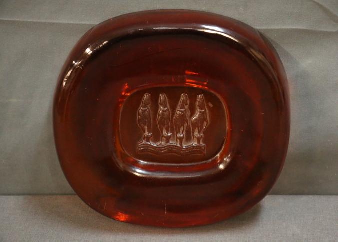 Believed to be Murano Glass Tray With Horse Design in center. Made of amber-hued glass, this tray features a central design depicting four standing horses. The surface shows wear and small scratches from previous use. Pickup only.