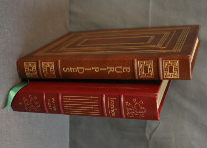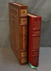 Easton Press Leather-Bound Editions: Euripides and Ivanhoe. Includes 'Medea, Hippolytus, The Bacchae' by Euripides, translated by Philip Vellacott with illustrations by Michael Ayrton, and 'Ivanhoe' by Sir Walter Scott, illustrated by Edward A. Wilson. Both volumes are collector's editions bound in genuine leather with gold leaf detailing and ribbon markers. Copyright 1977 and 1980 by The Easton Press.